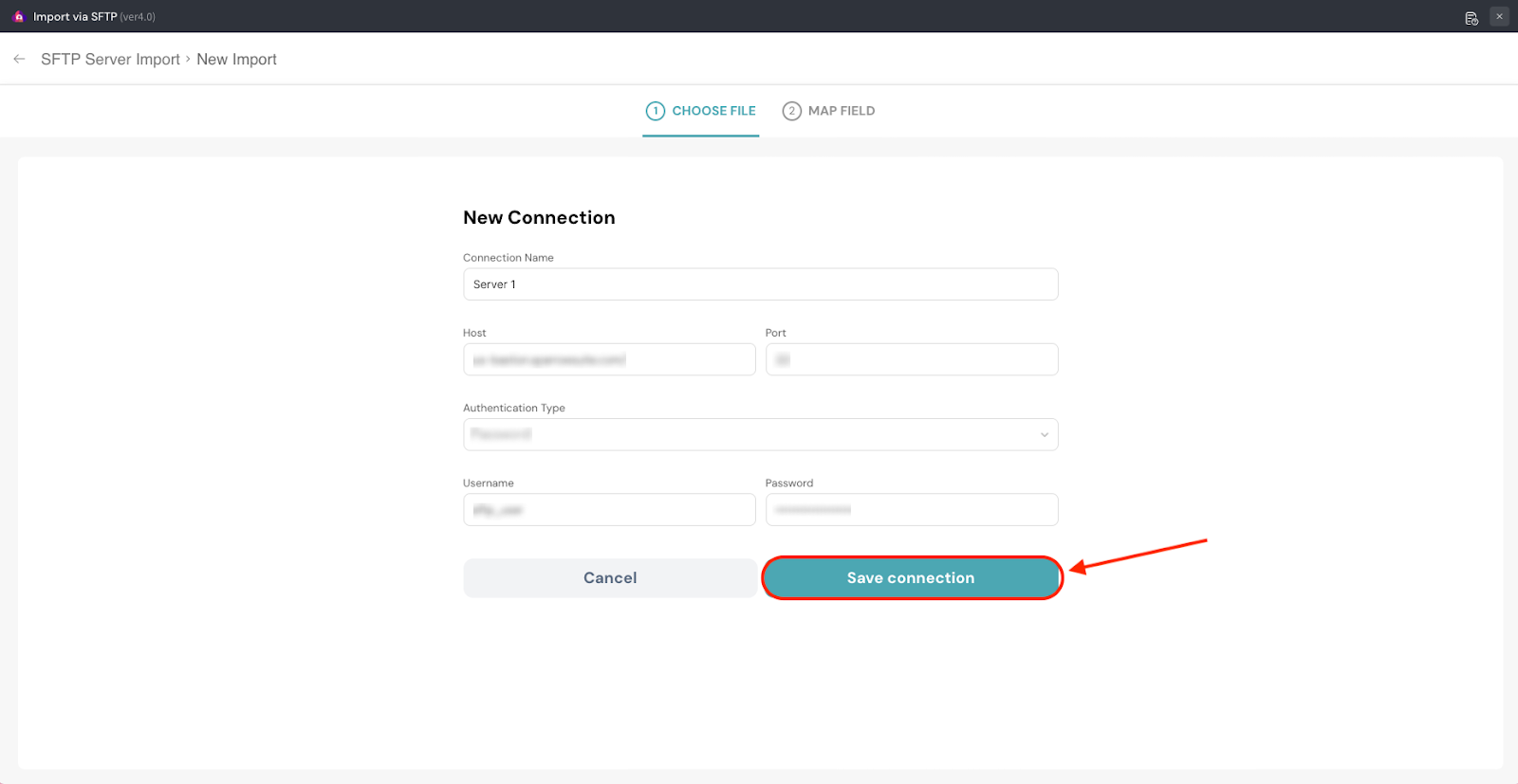 6. Set up the connection by typing the credentials in the respective fields. Once done, click Save Connection.