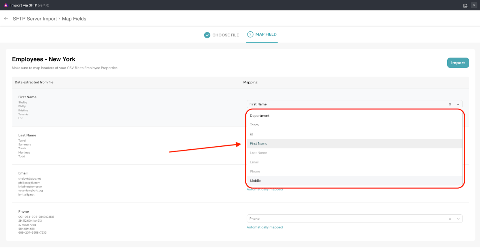12. Fields with essential data like names get automatically mapped. In case there is any data that is unmapped, or if you want a different mapping for a particular data field, you can change it. Click on the corresponding drop-down menu under the Mapping column and choose from the options.