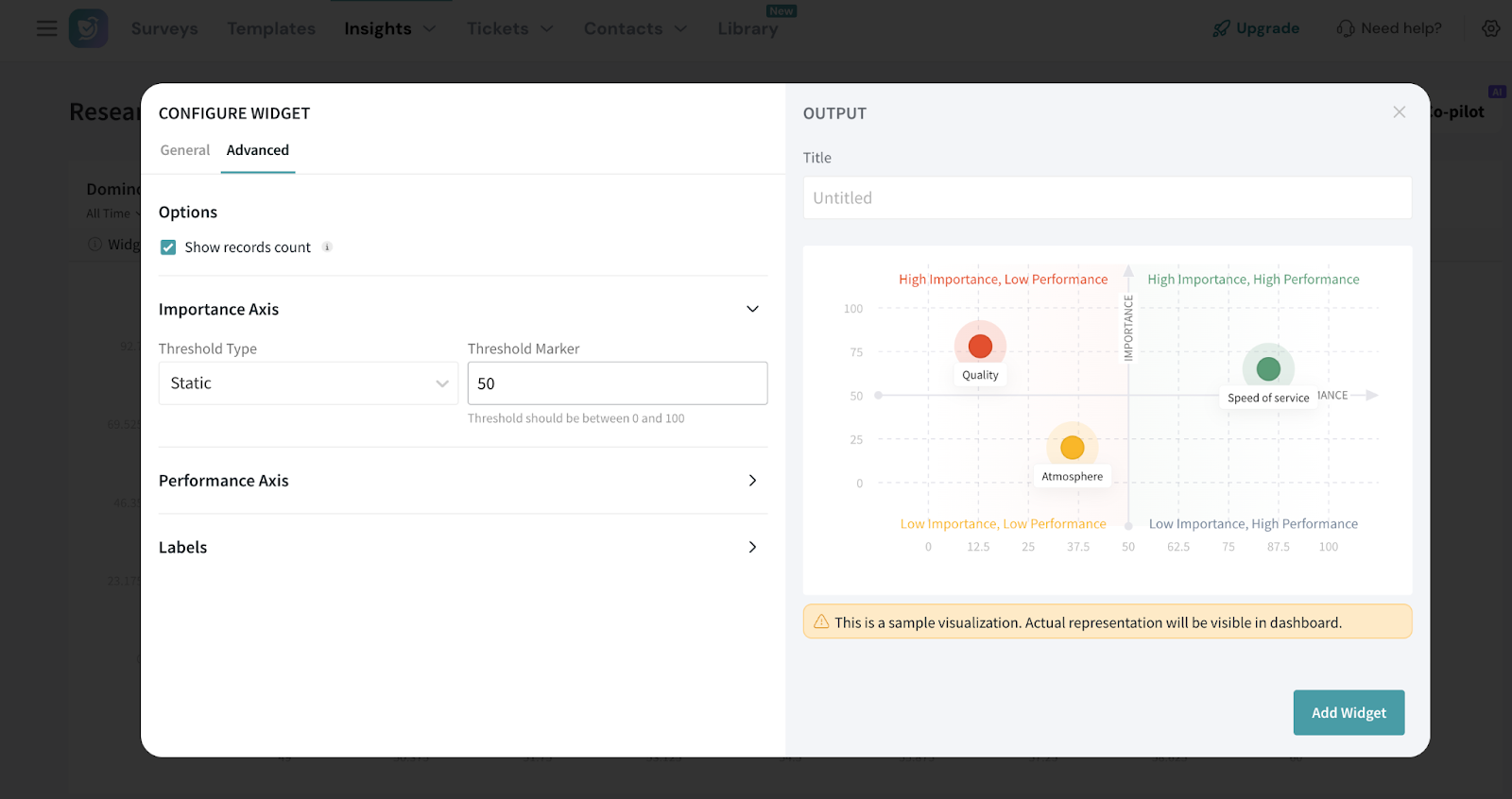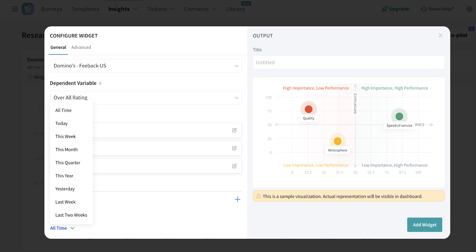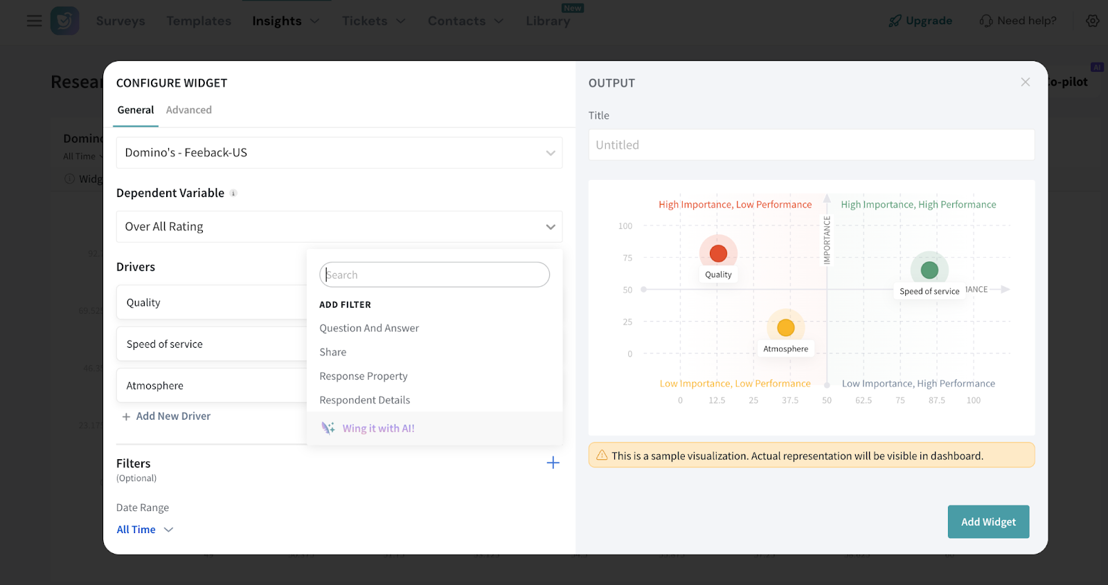 The Key Drivers provides a data-driven way to identify drivers of the outcome metric. It also helps understand how these drivers collectively influence a single outcome such as customer satisfaction, Overall Rating, NPS, CSAT, CES, or effort score. Using advanced regression-based statistical techniques, it evaluates all potential drivers together rather than individually. This approach reveals both the strength of each driver’s impact (importance) and your current performance on them, giving a clear, holistic view of what truly affects the outcome.