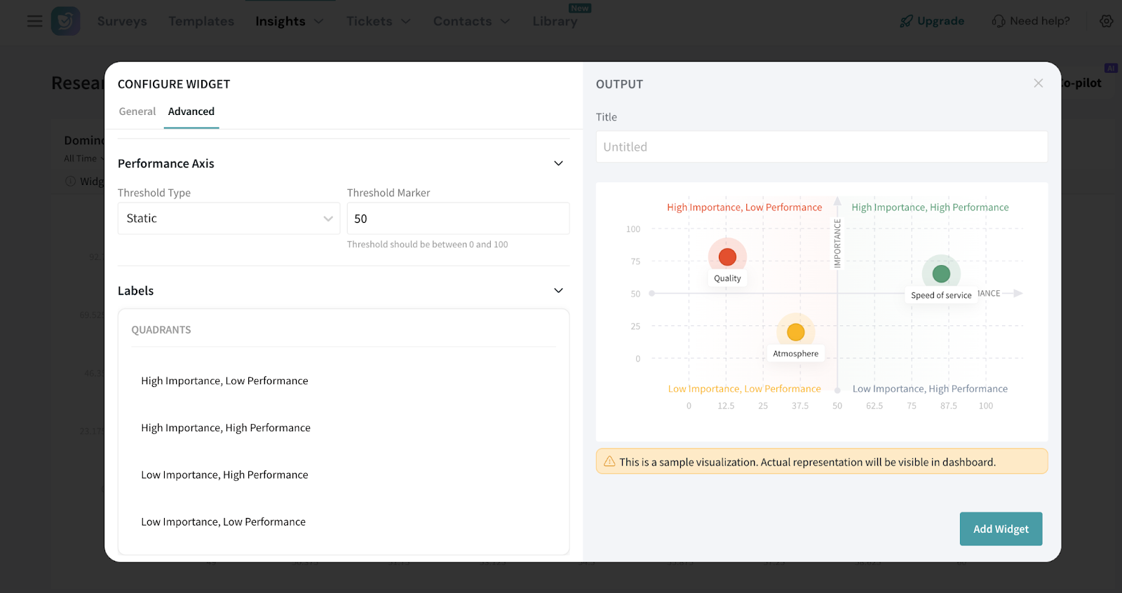 Visualizes each driver on a quadrant chart showing:a)Importance (Y-axis): Output of the RIA regression model (0 to 100)b)Performance (X-axis): Calculated using weighted average, converted to a 0–100% scale.