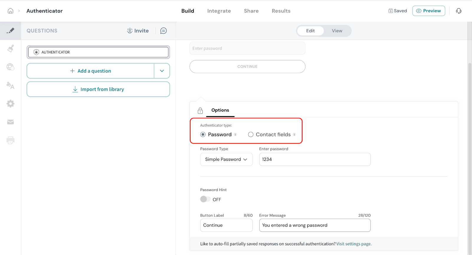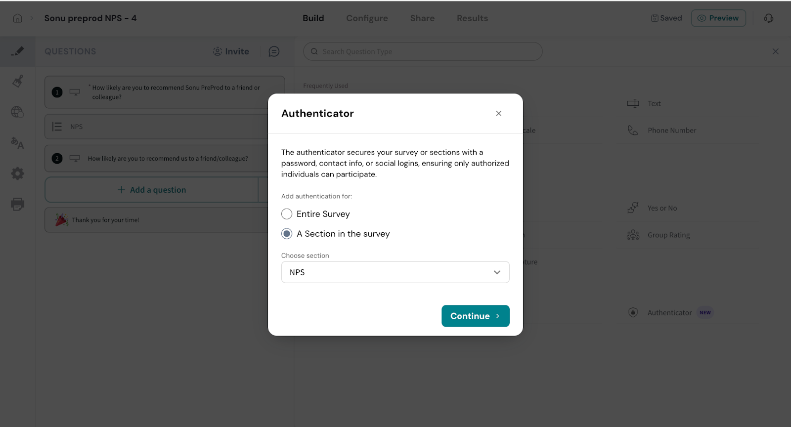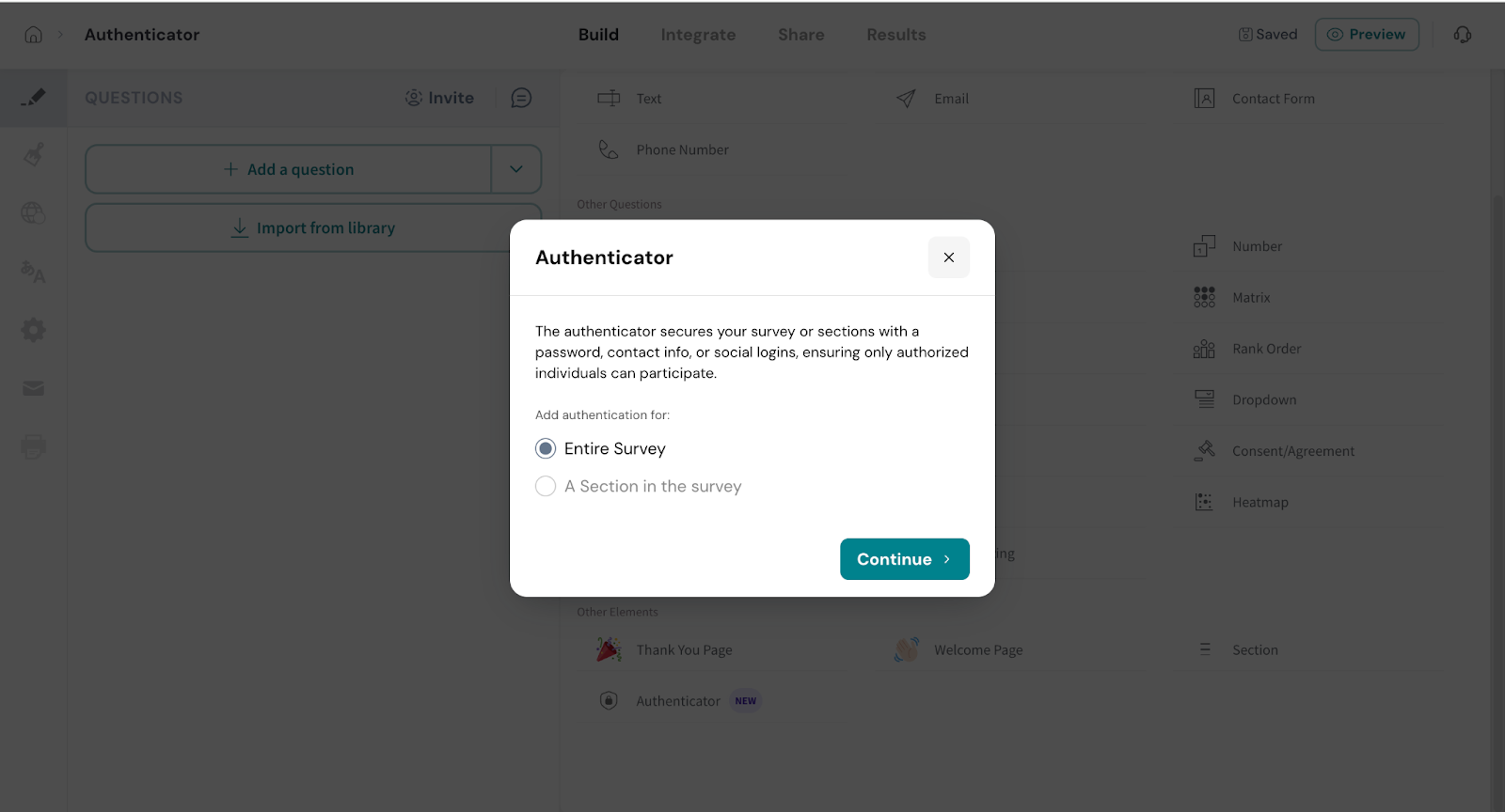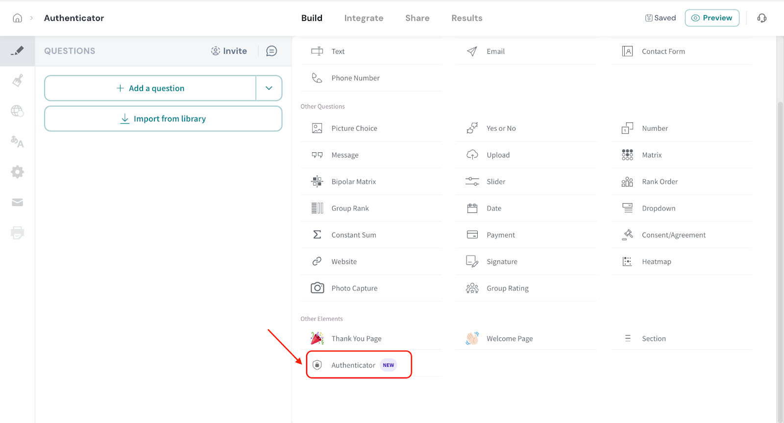 - Click on Authenticator from the survey elements panel.