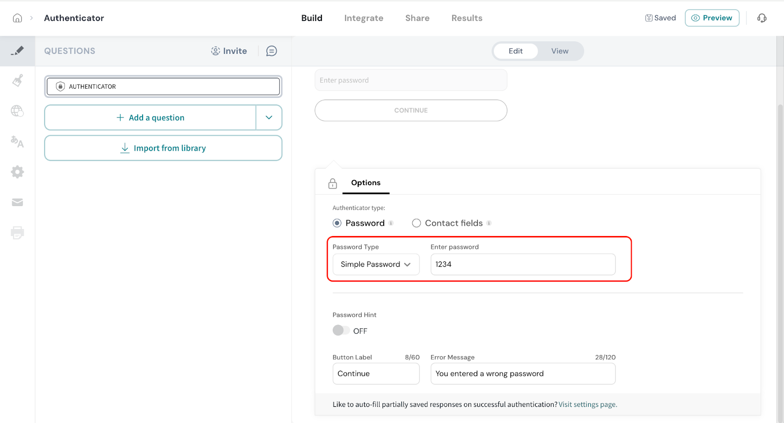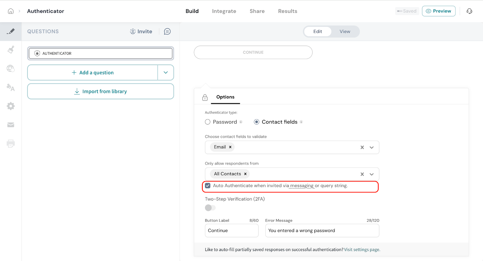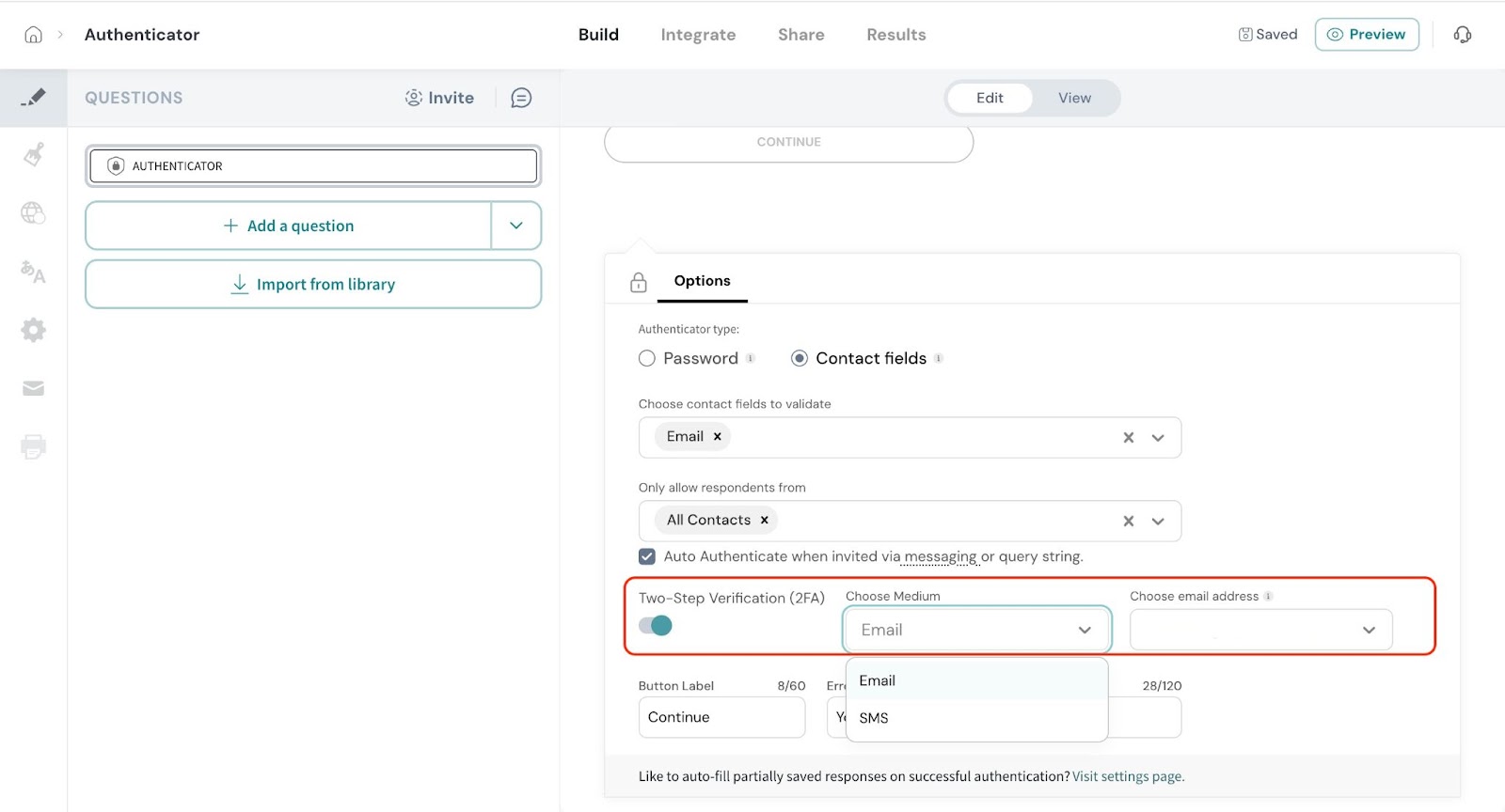 - Click on Authenticator from the survey elements panel.