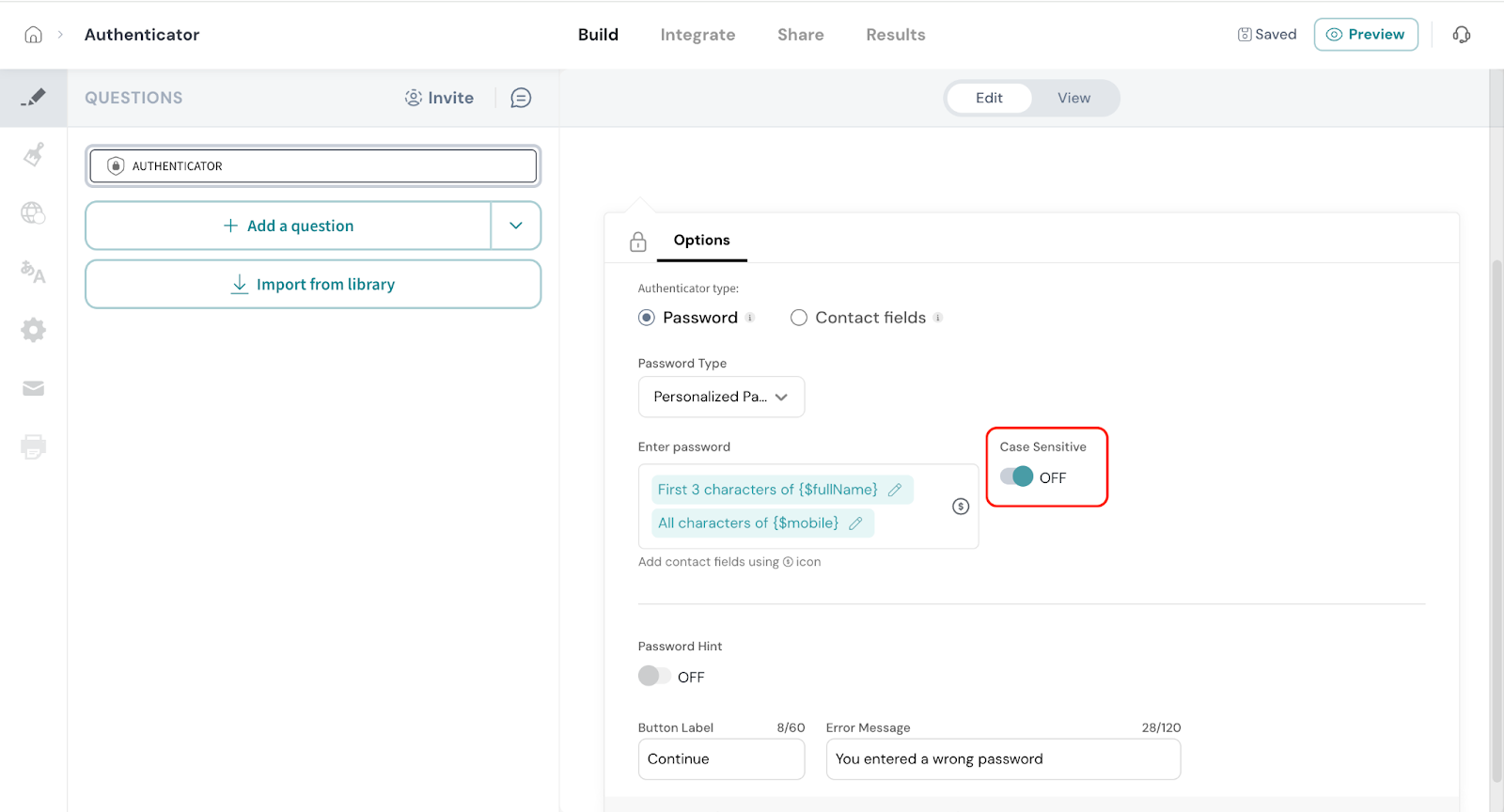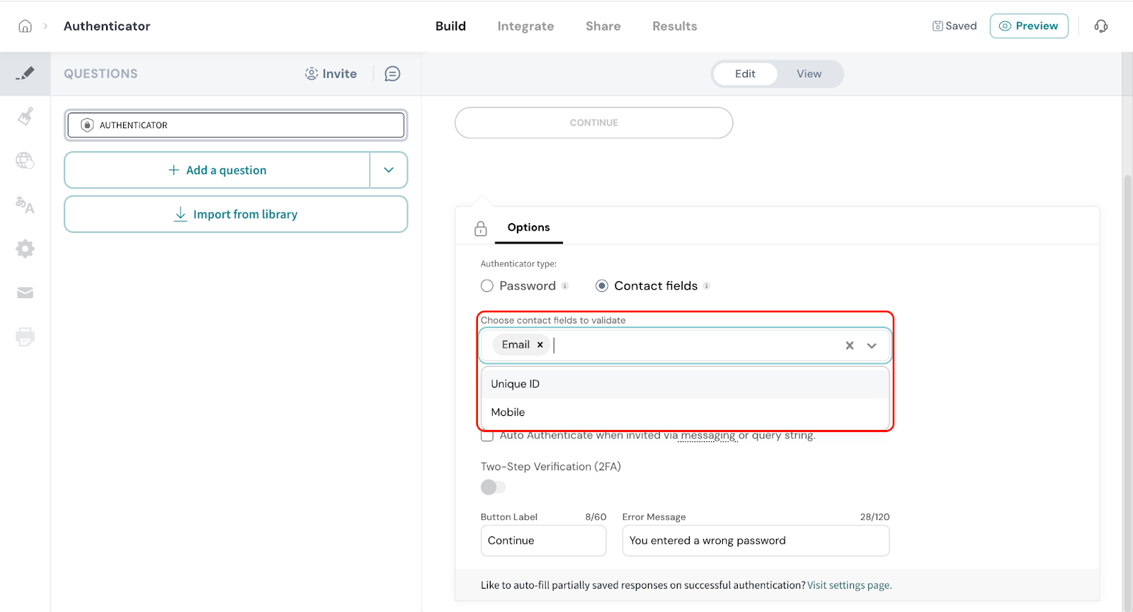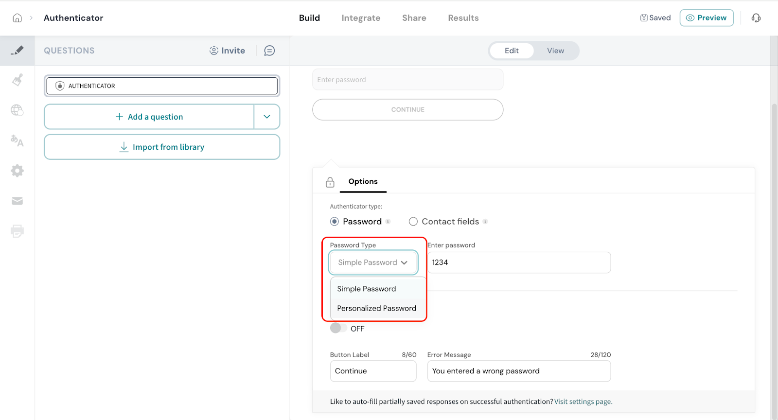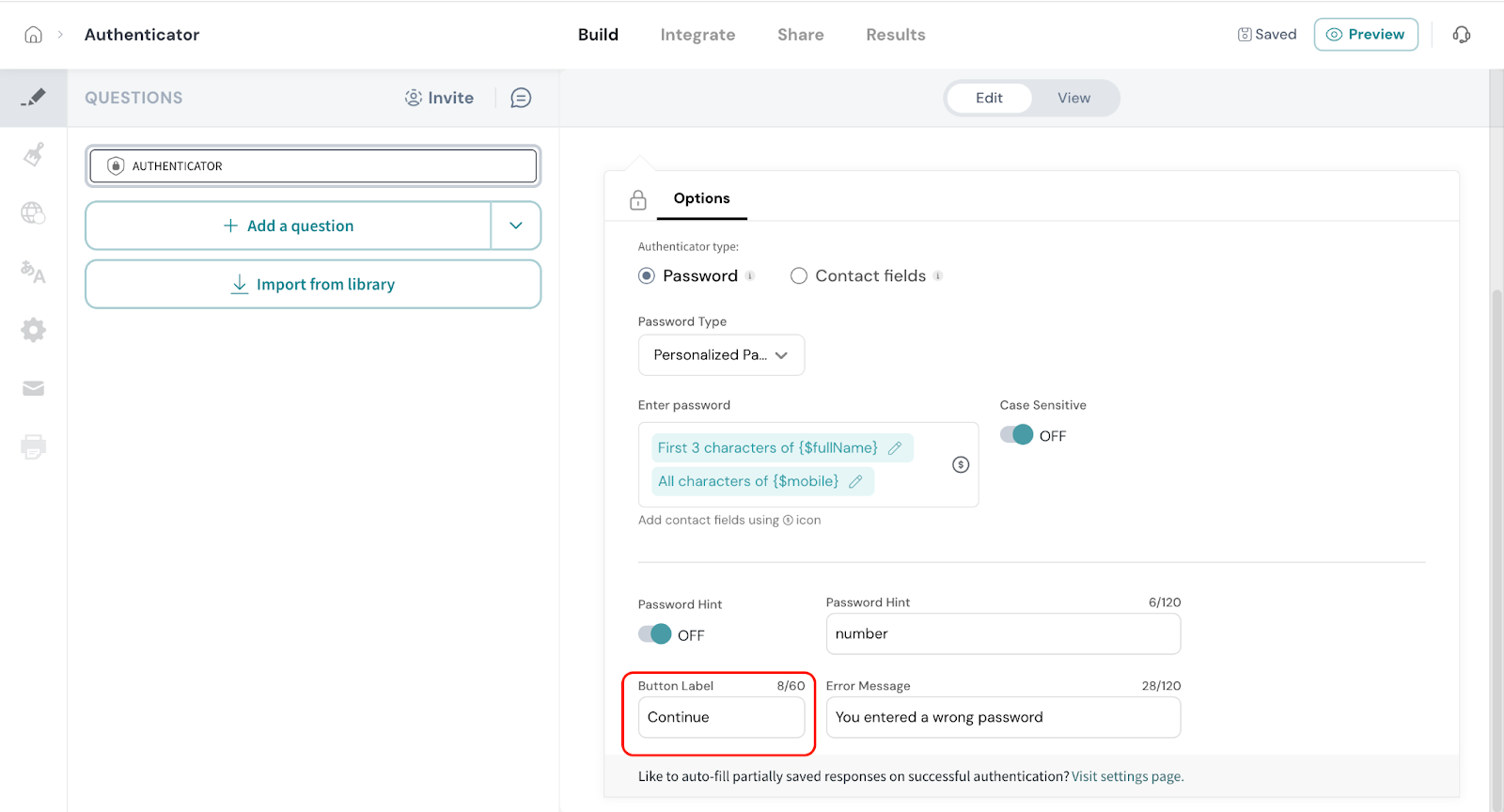 - Click on Authenticator from the survey elements panel.
