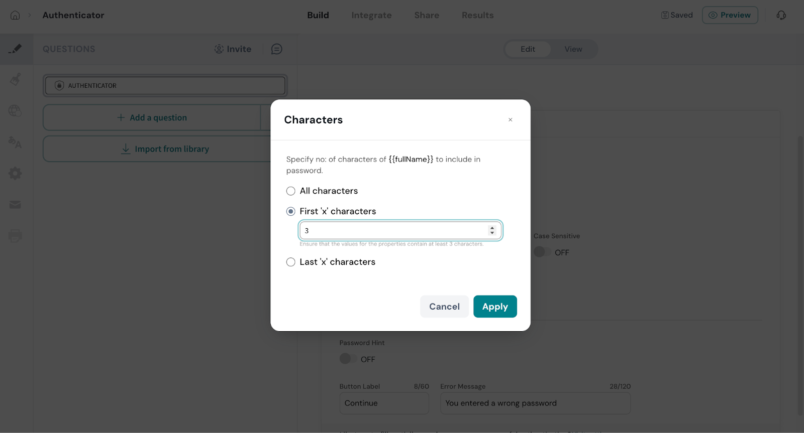 Example: You can set a password format where the respondent must enter the first three letters of their name, followed by their date of birth, and then the last three digits of their mobile number. Each respondent’s password will be generated based on their individual contact details.