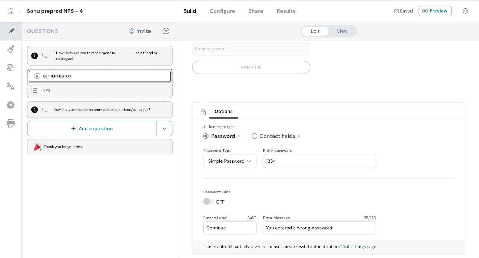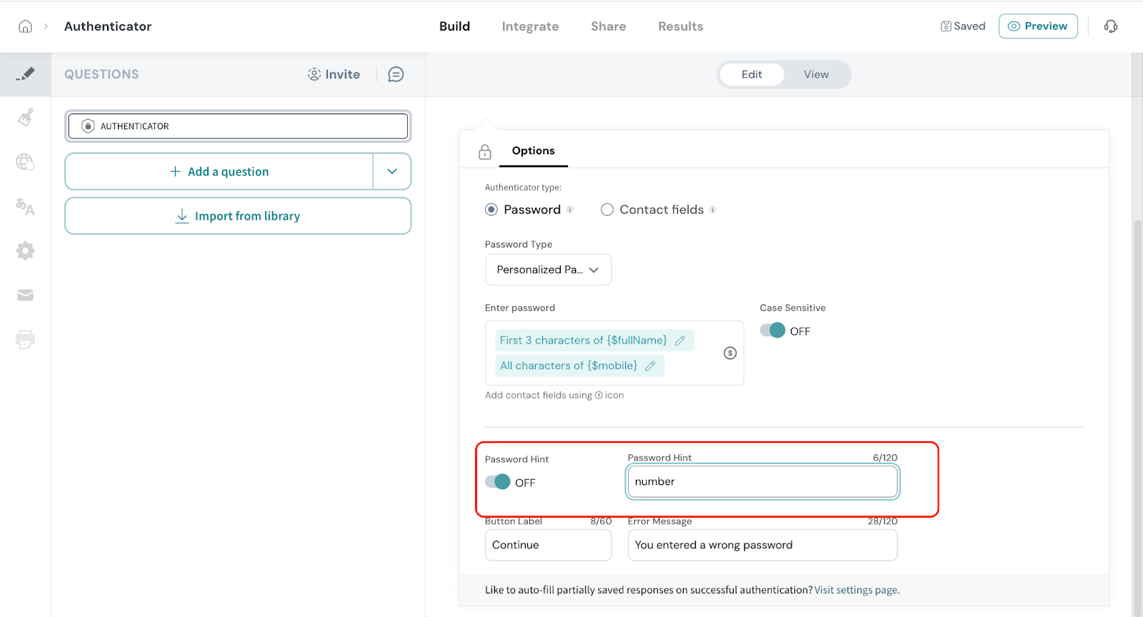 Password Hint: You can choose to display a hint to help respondents enter the correct password.