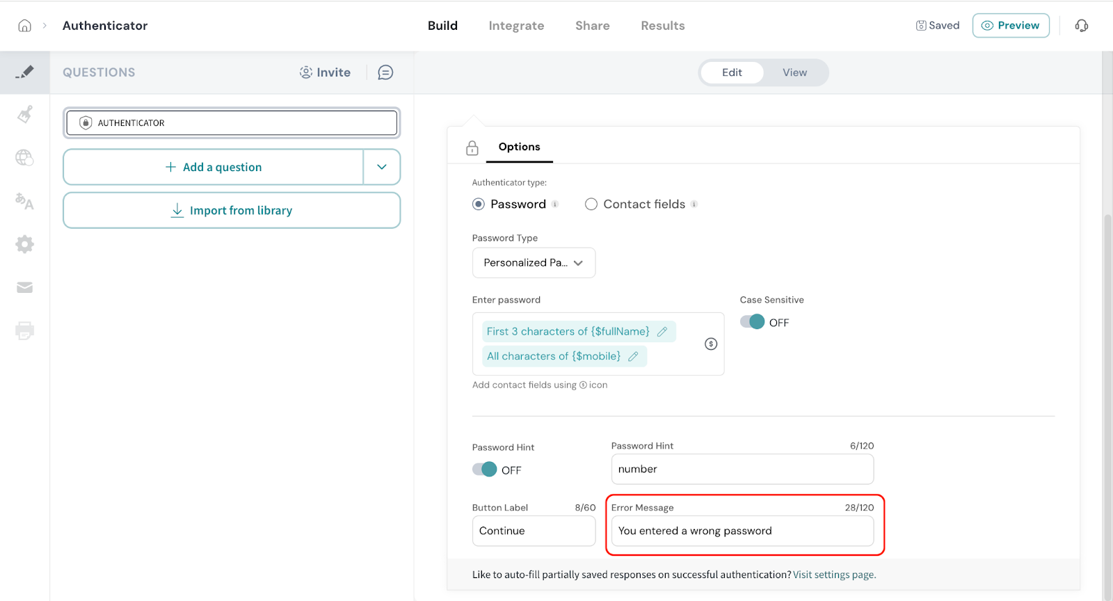 8. Error Message: If a respondent enters the wrong password, an error message will appear. You can edit this message to display it in your preferred wording.