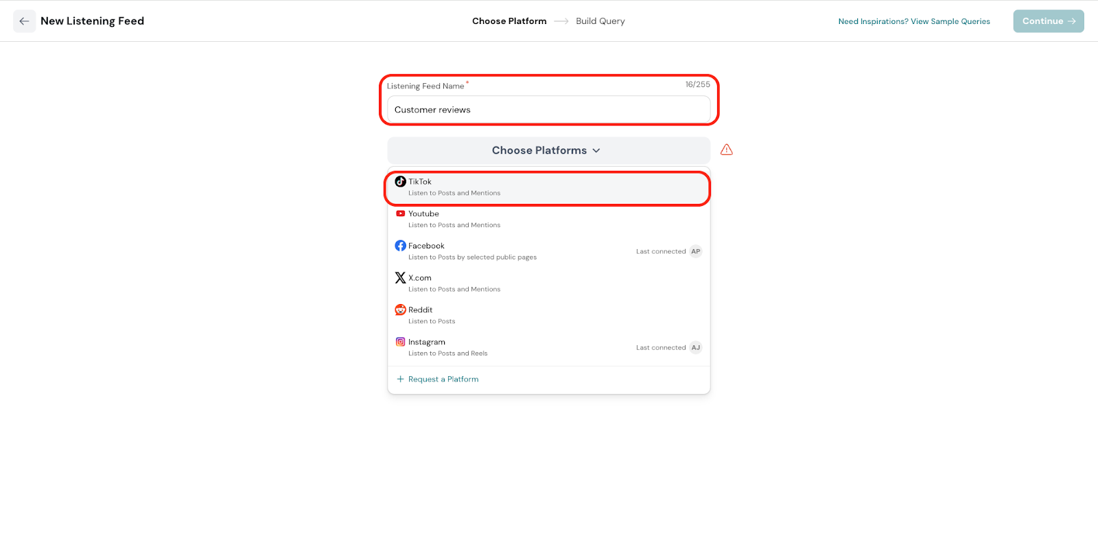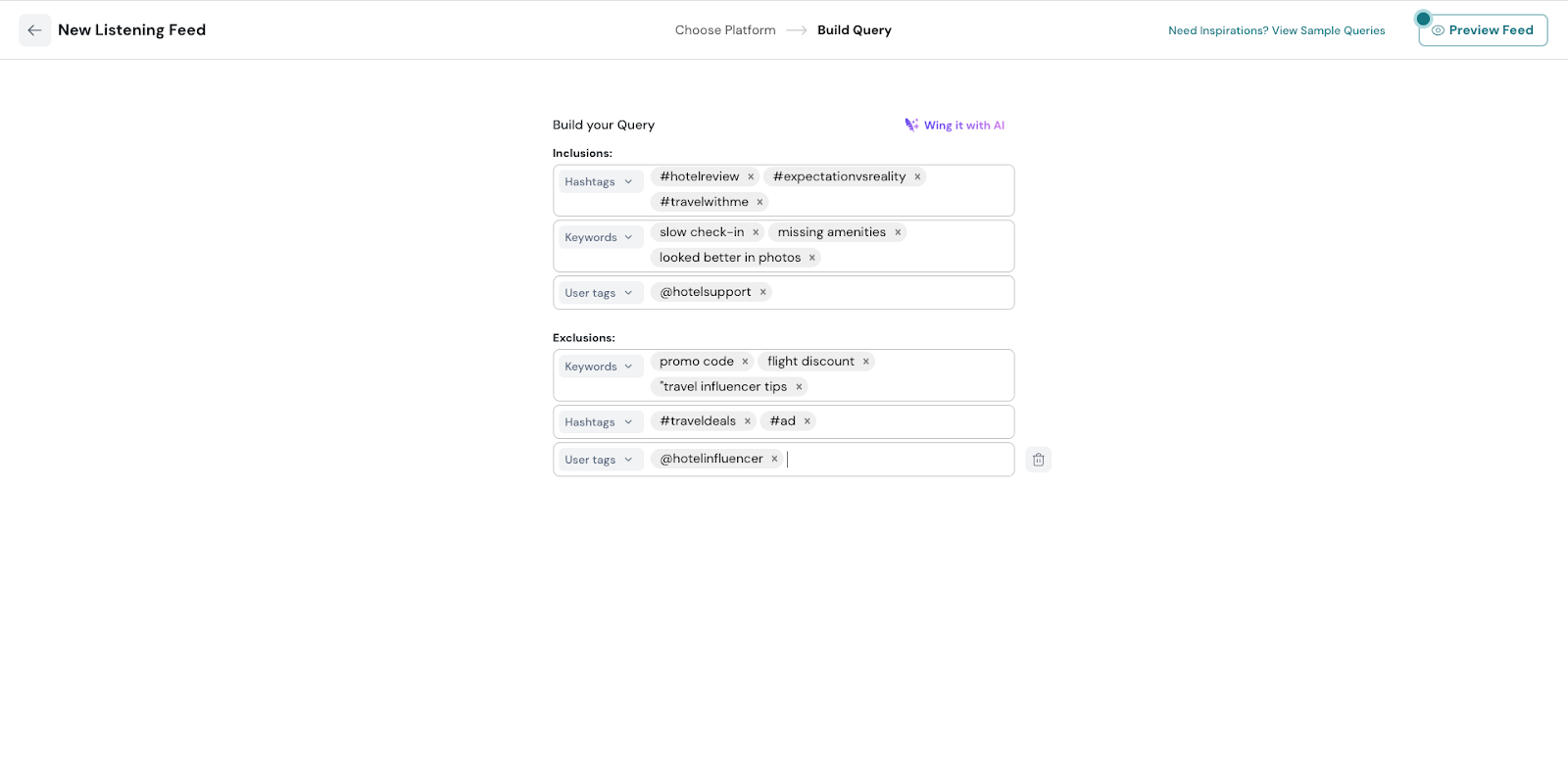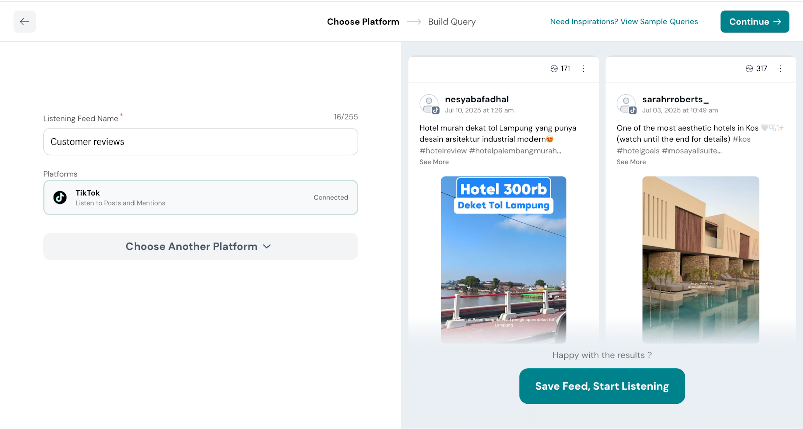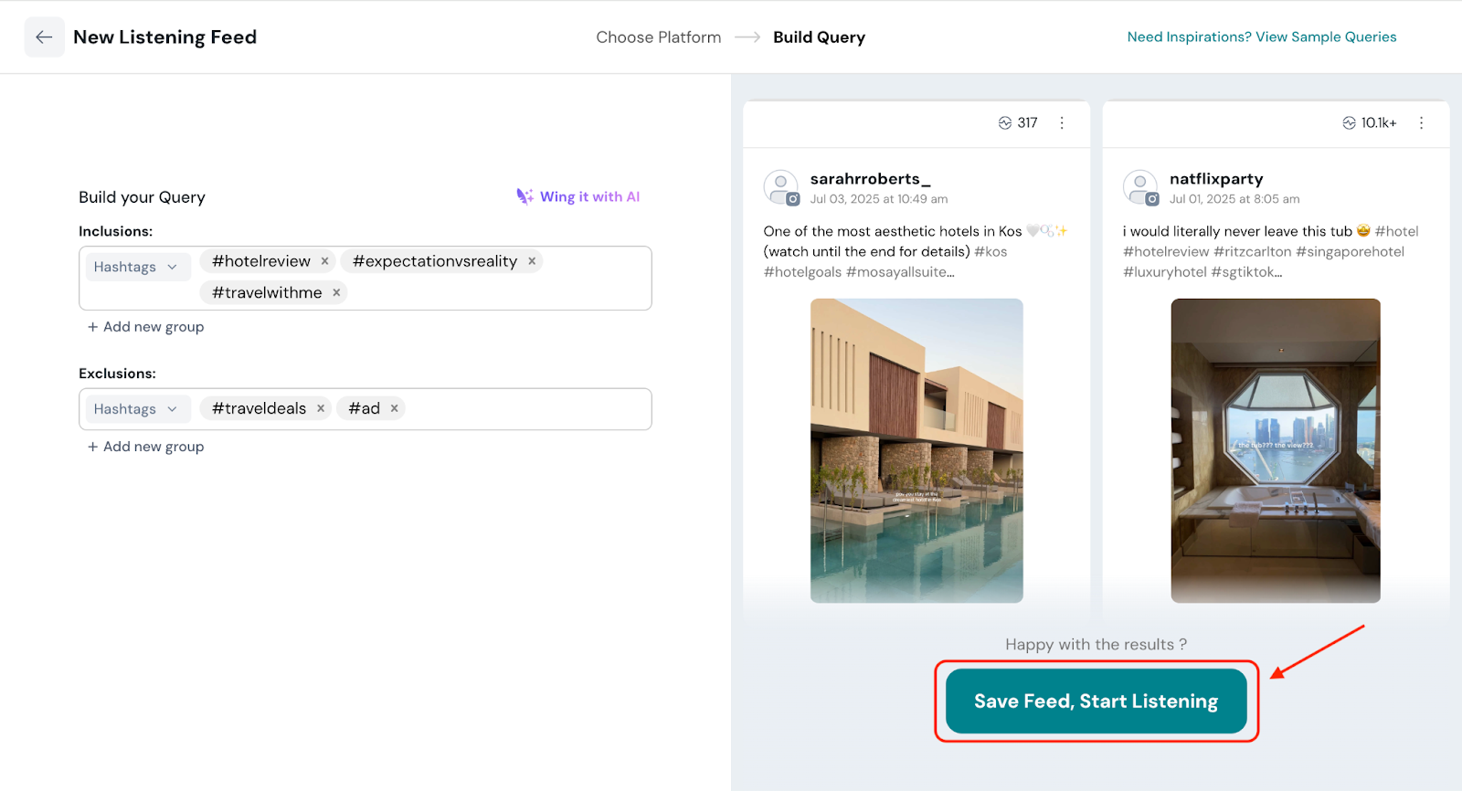 In this step, you’ll be able to customize your listening feed by selecting specific hashtags, keywords, and @tags to include or exclude, helping you focus on the most relevant conversations.