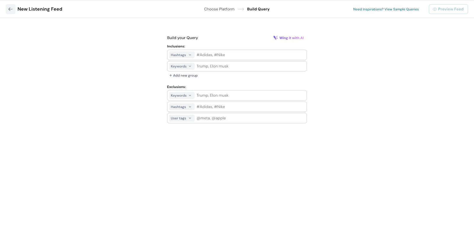 Note: You can use the "Add Group" to create separate groups for hashtags, keywords, or user tags in your inclusions and exclusions while building your query. This helps organize and refine your listening feed for more precise results.