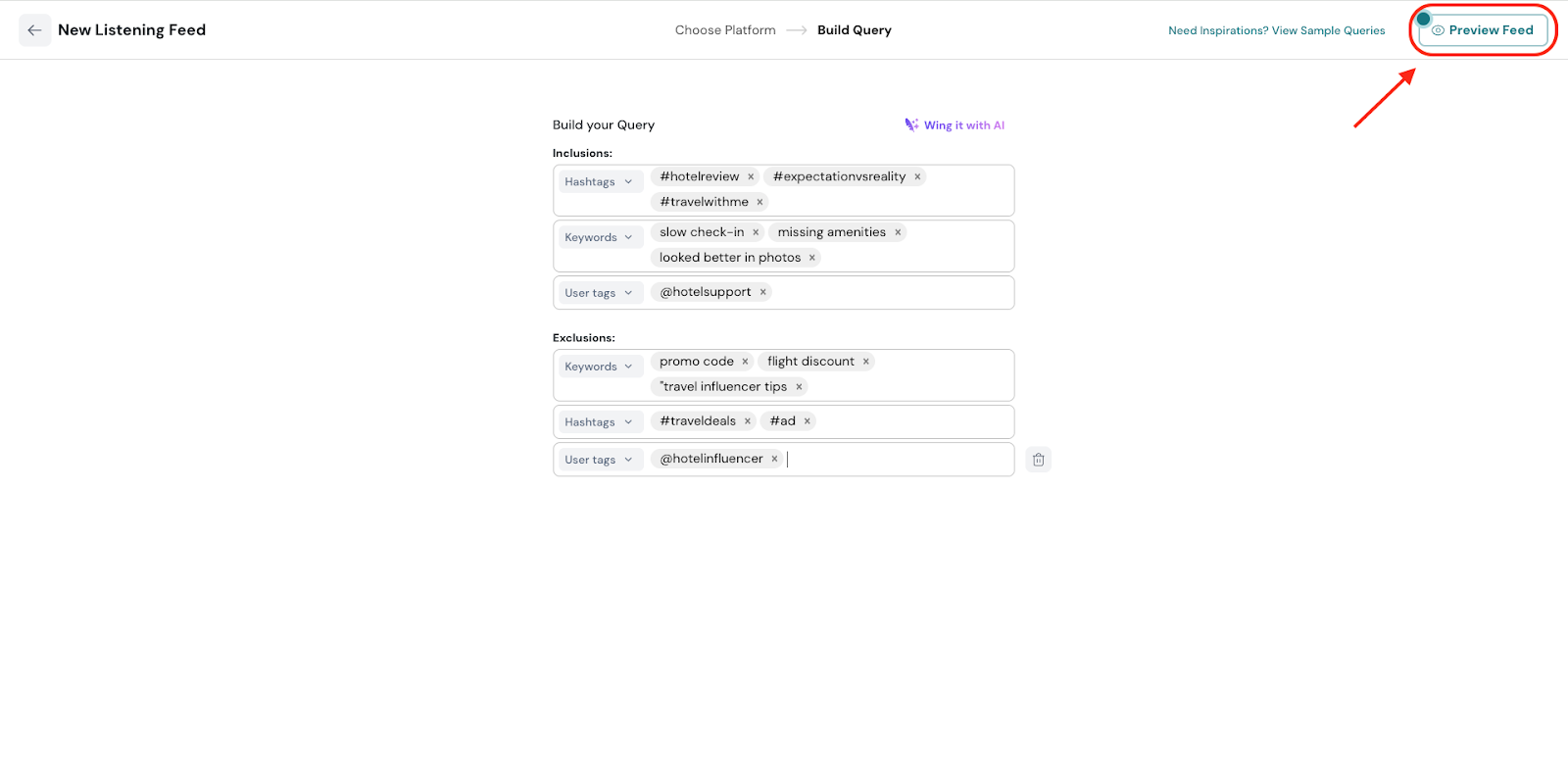 In our example, we have included hashtags like #hotelreview, #expectationvsreality, and #travelwithme, keywords such as "slow check-in", "missing amenities", and "looked better in photos", and relevant @mentions of the brand’s handle to capture real guest experiences while excluding unrelated terms like #ad, #traveldeals, or keywords like "promo code", "flight discount", and "travel influencer tips" to keep the results focused and actionable.