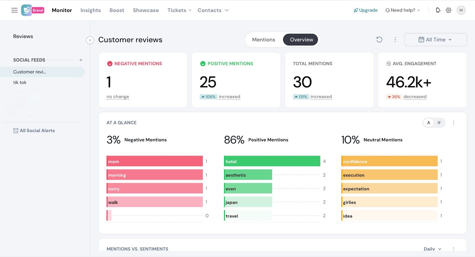 11. You also have access to an Overview Dashboard, which provides a comprehensive summary of your listening feed's performance. It brings together key insights such as mention volume over time, daily sentiment trends, spikes in conversation, engagement breakdowns, and the most-used keywords and hashtags.