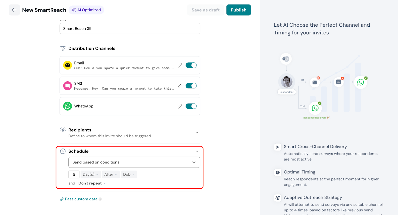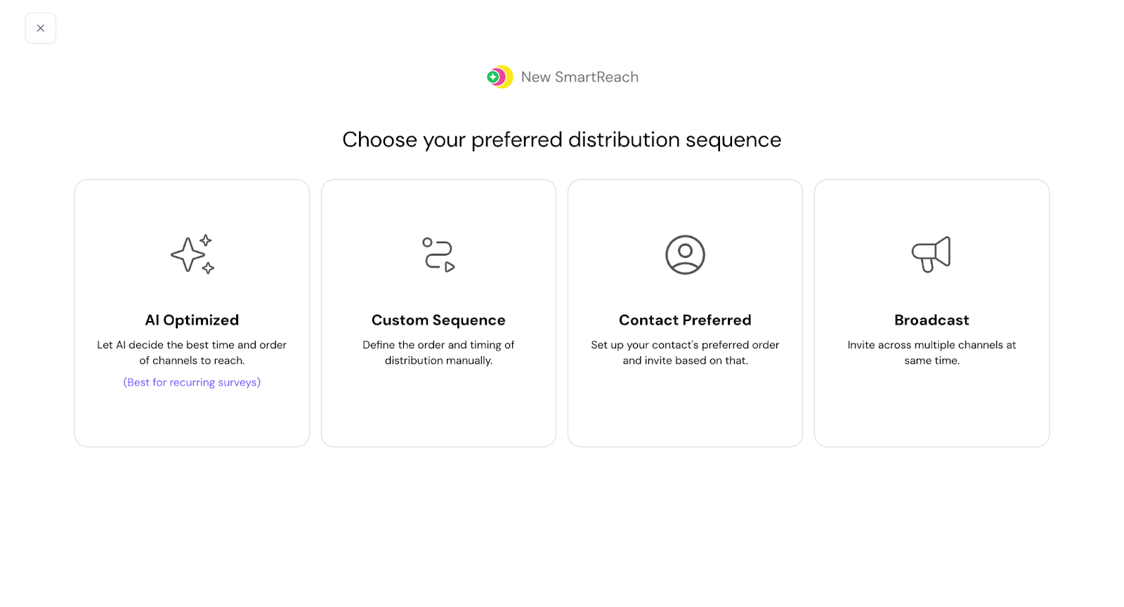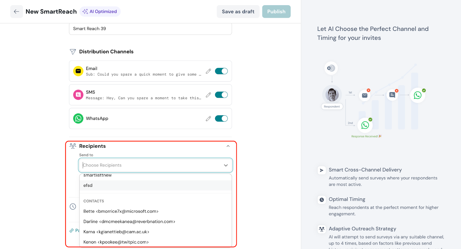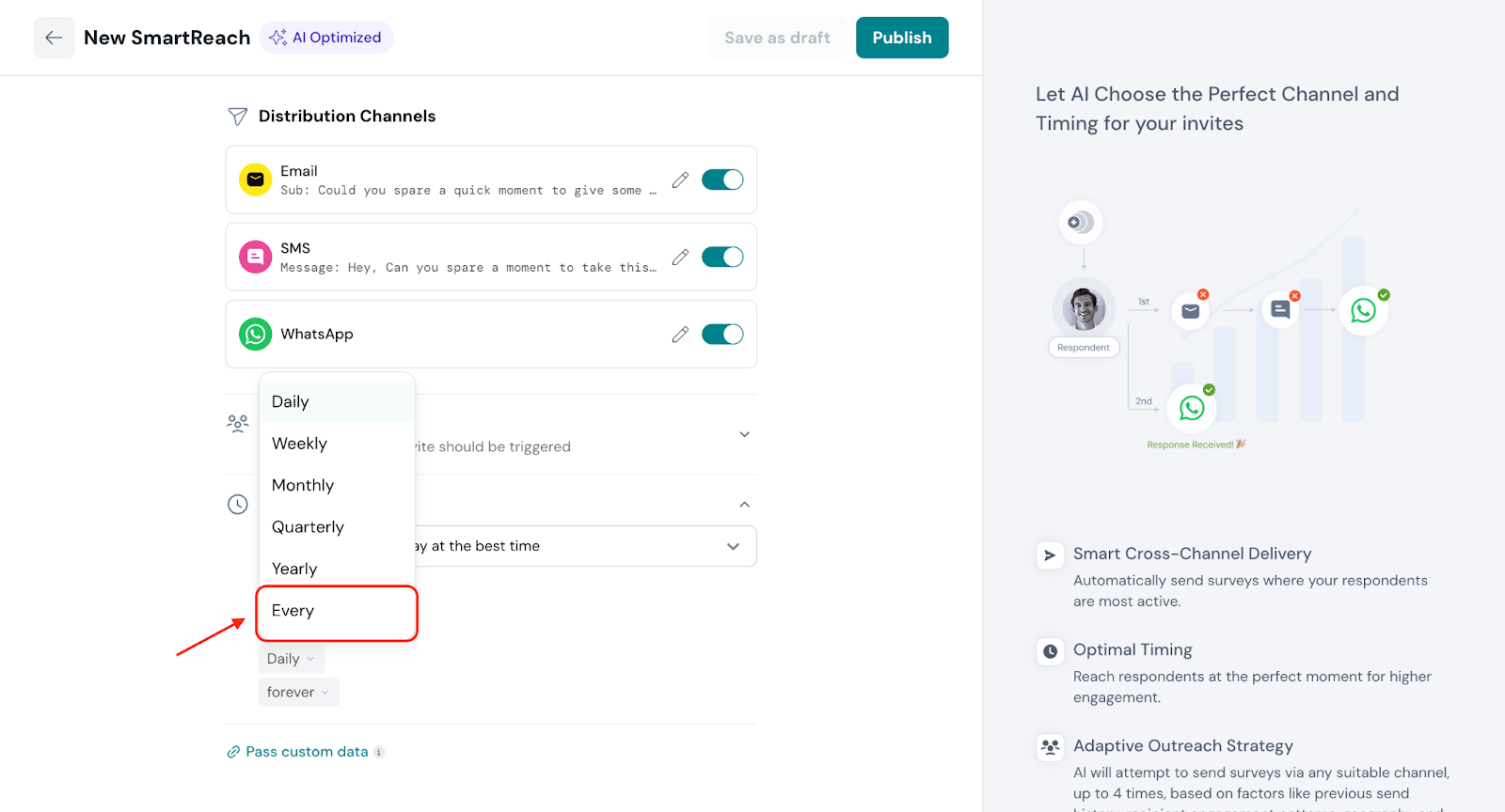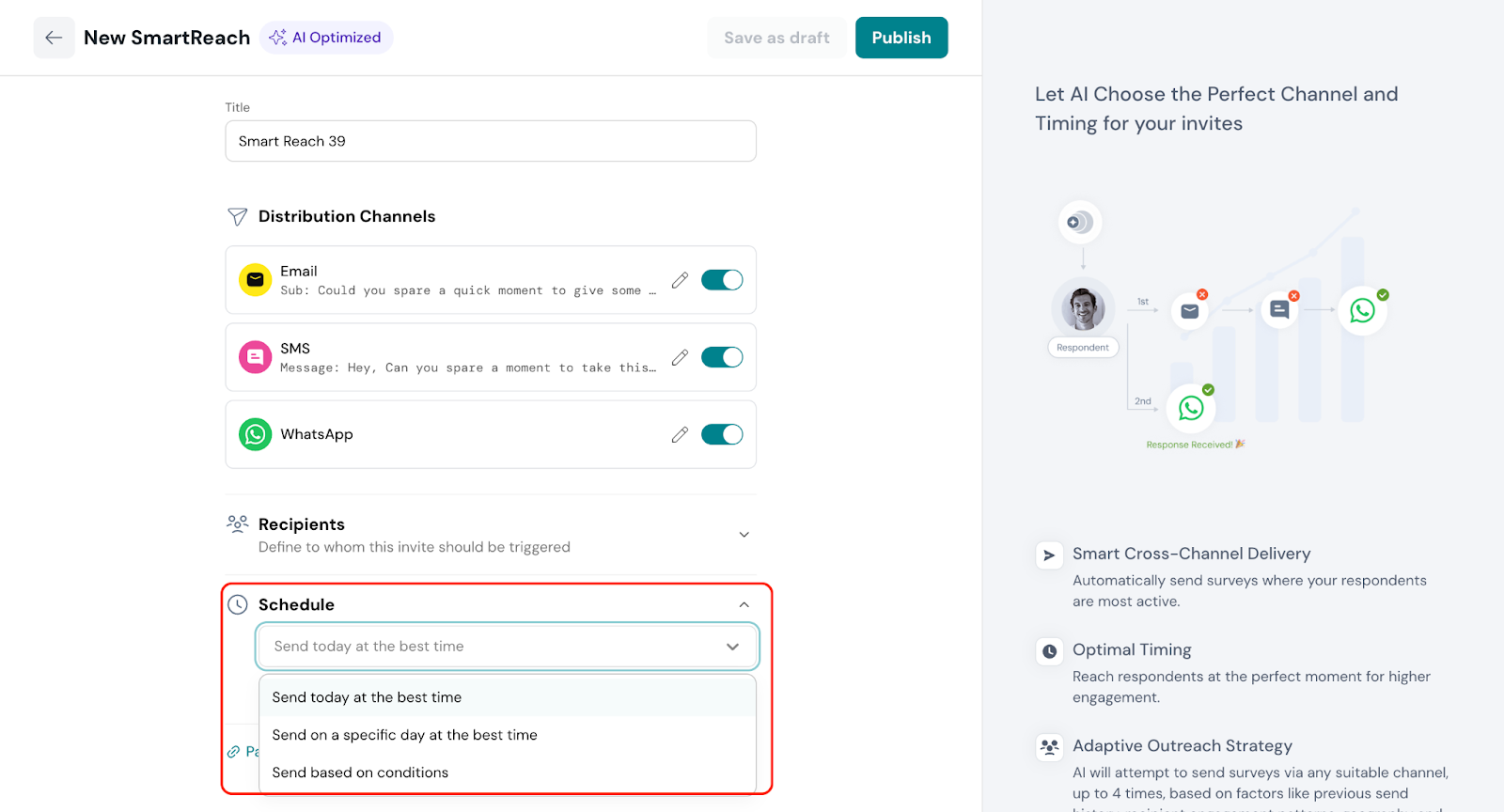 This mode lets SmartReach’s AI take full control. It automatically determines the best channel, whether that’s Email, SMS, or WhatsApp and the most effective time to send the survey, based on each contact’s past behavior and engagement history.