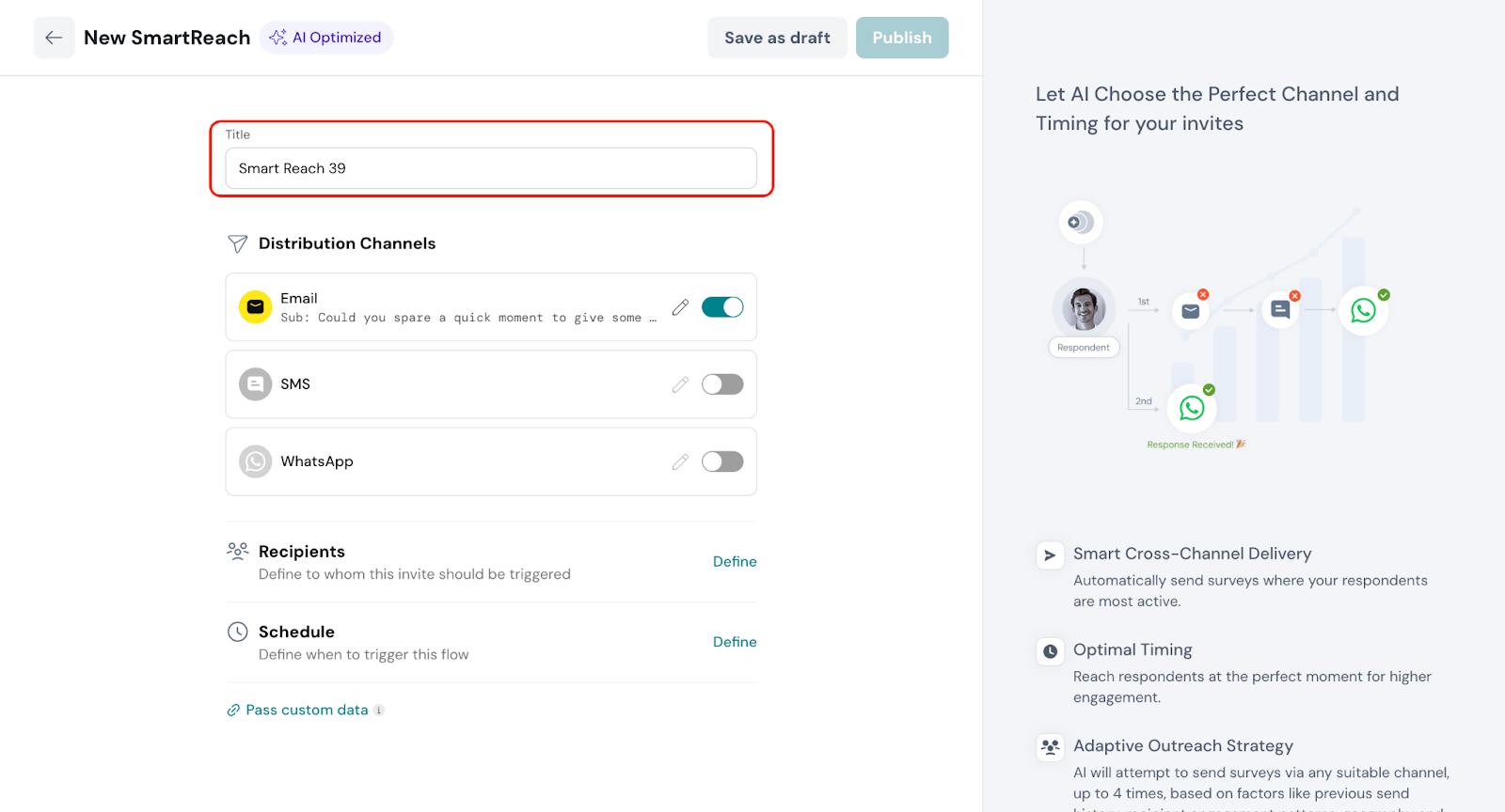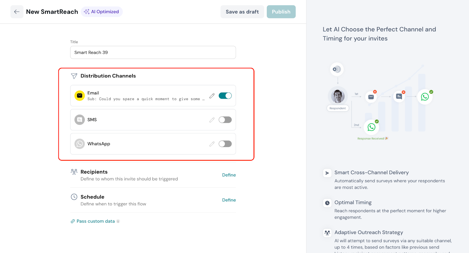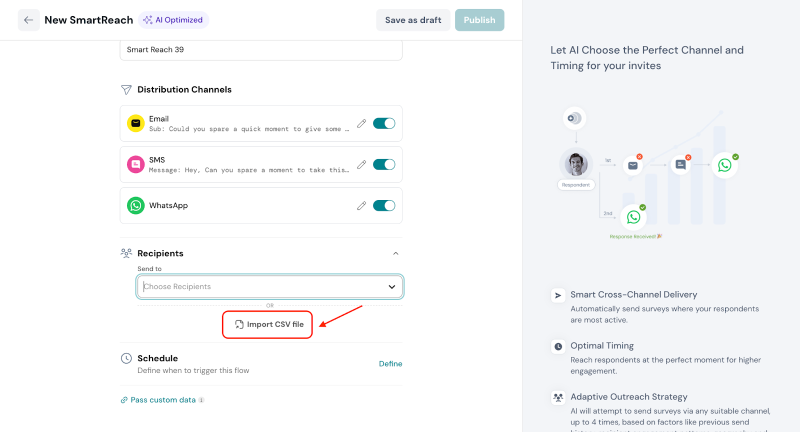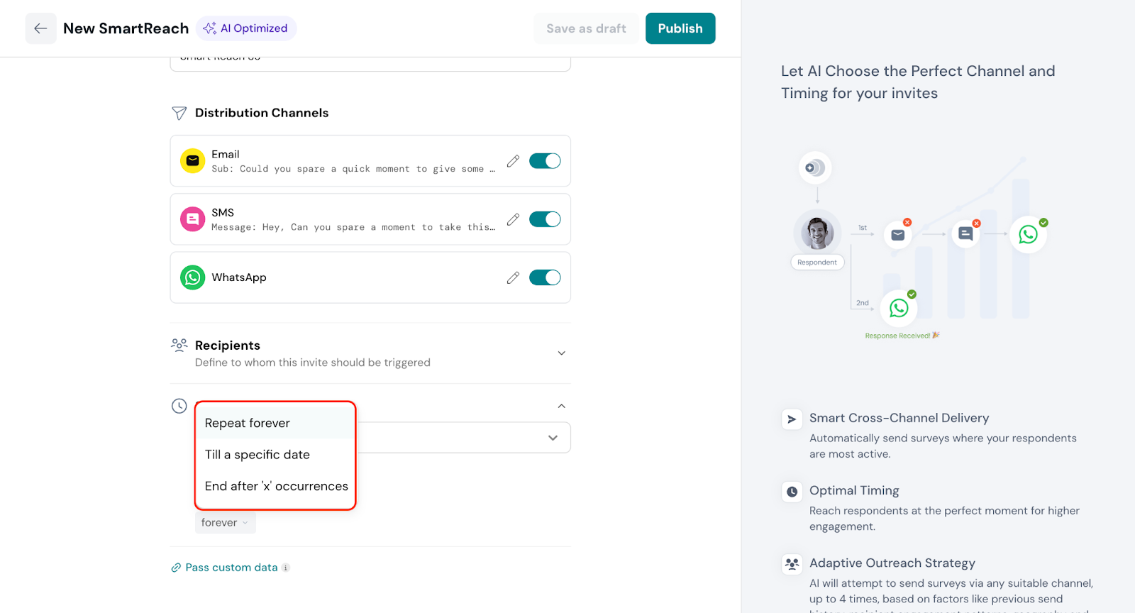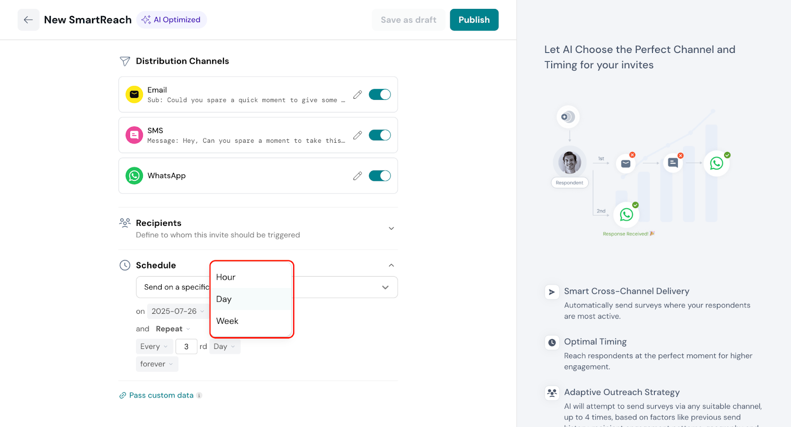 This mode lets SmartReach’s AI take full control. It automatically determines the best channel, whether that’s Email, SMS, or WhatsApp and the most effective time to send the survey, based on each contact’s past behavior and engagement history.