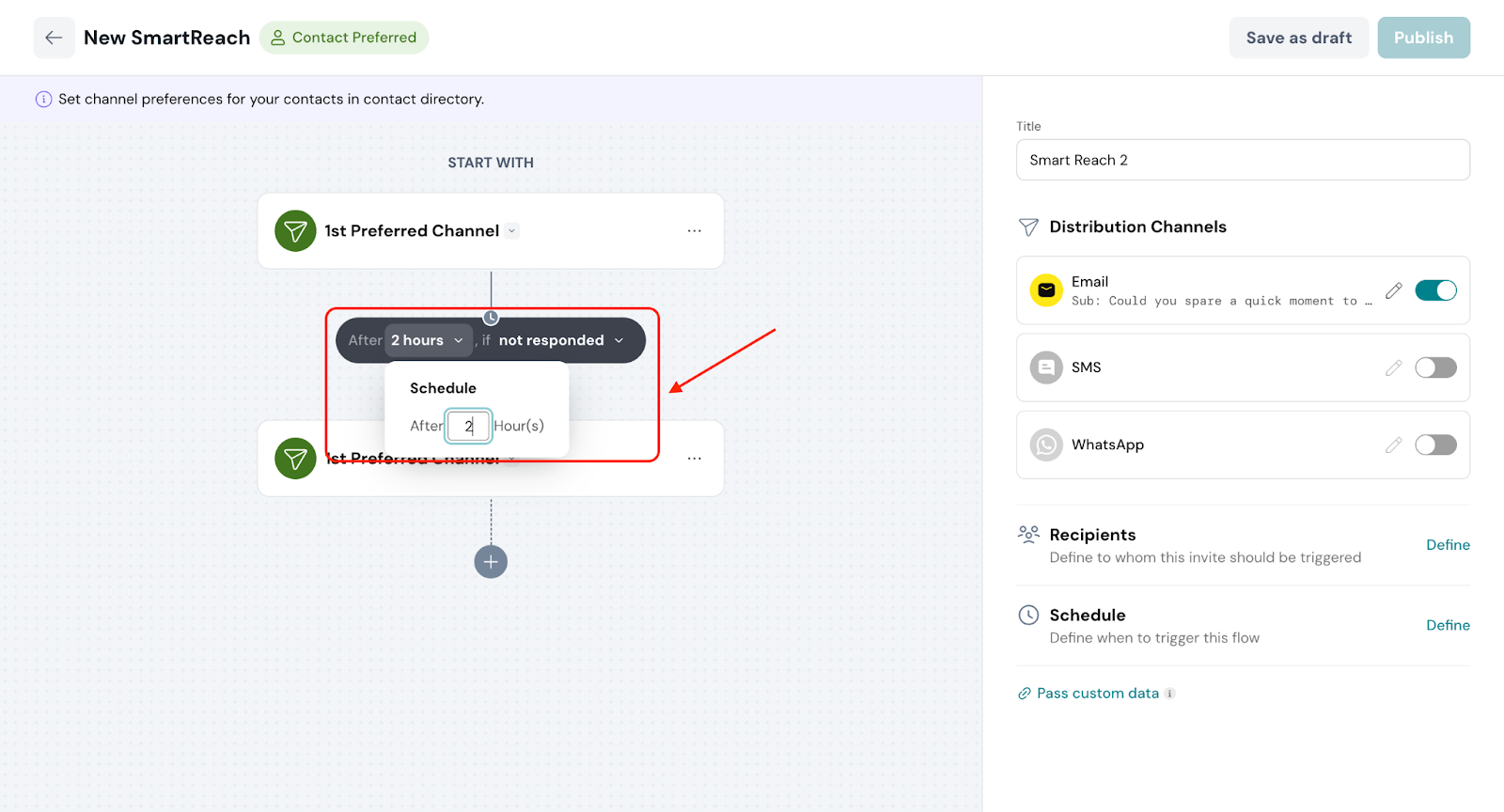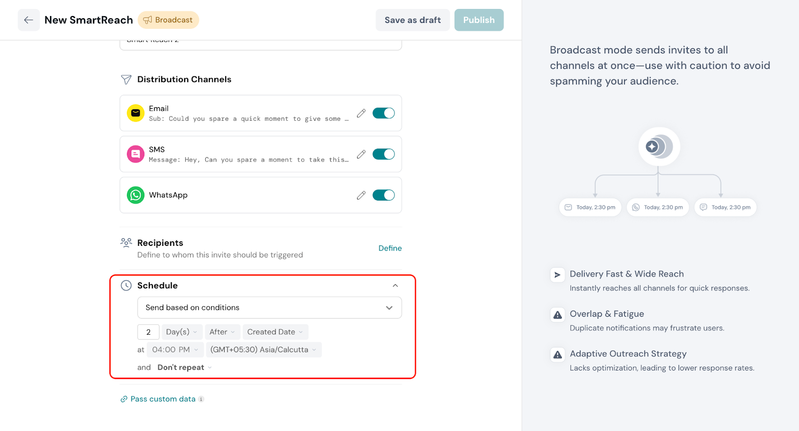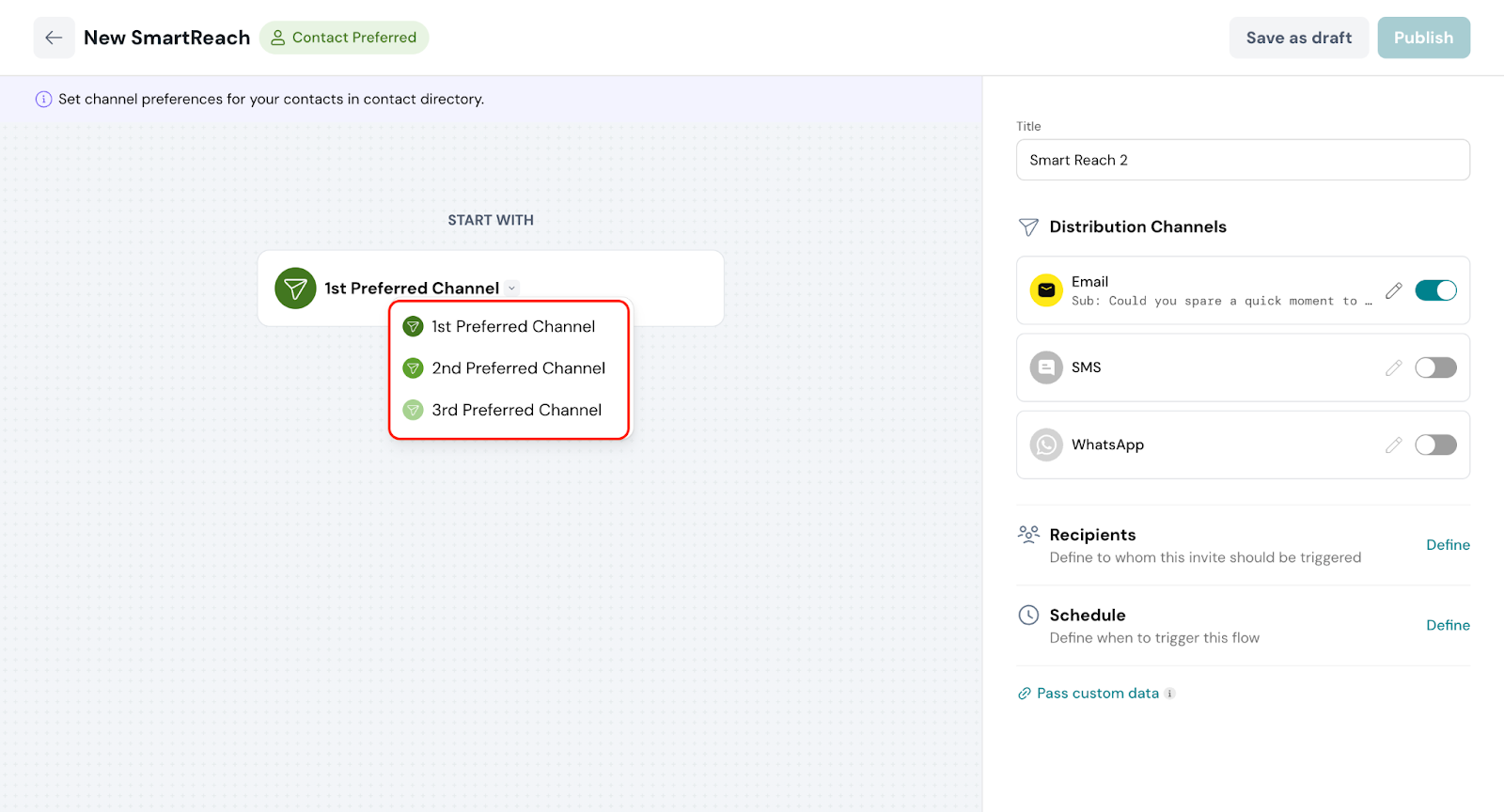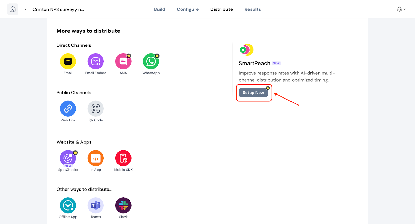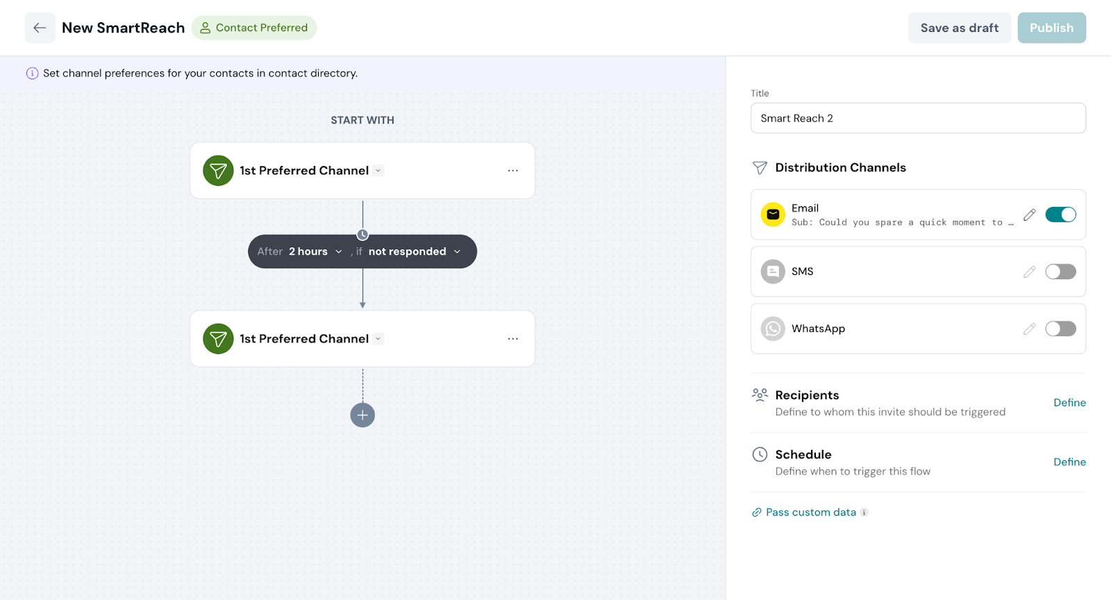 This mode lets SmartReach’s AI take full control. It automatically determines the best channel, whether that’s Email, SMS, or WhatsApp and the most effective time to send the survey, based on each contact’s past behavior and engagement history.