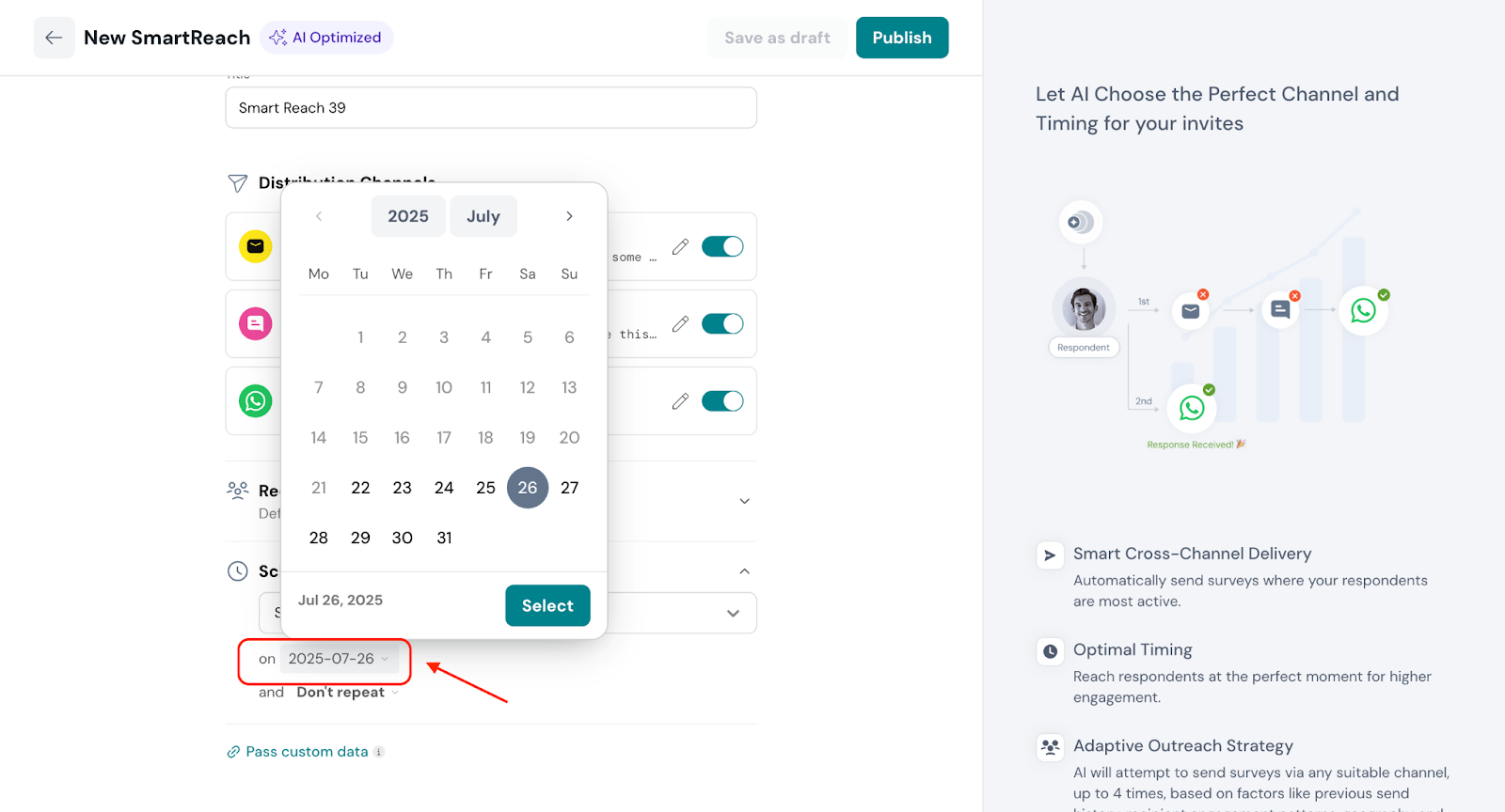 Note: SmartReach’s AI will attempt to send the survey up to four times using the most suitable channel each time. It considers factors like past send history, recipient engagement patterns, geography, and time zone to maximize the chances of getting a response. - Send on a Specific Day at the Best Time: With this option, you can select the exact day you want the survey to be triggered, and SmartReach’s AI will determine the best time on that day to send it based on recipient behavior. You also have the flexibility to choose whether the survey should repeat or not repeat. If you select Don’t repeat, the survey will be sent just once with no follow-ups.