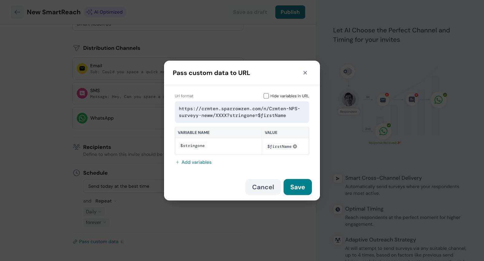 7. Pass Custom Data: You can personalize your surveys by adding custom variables, such as the recipient’s first name. This allows you to tailor the survey content for each individual, making your outreach more relevant and engaging.