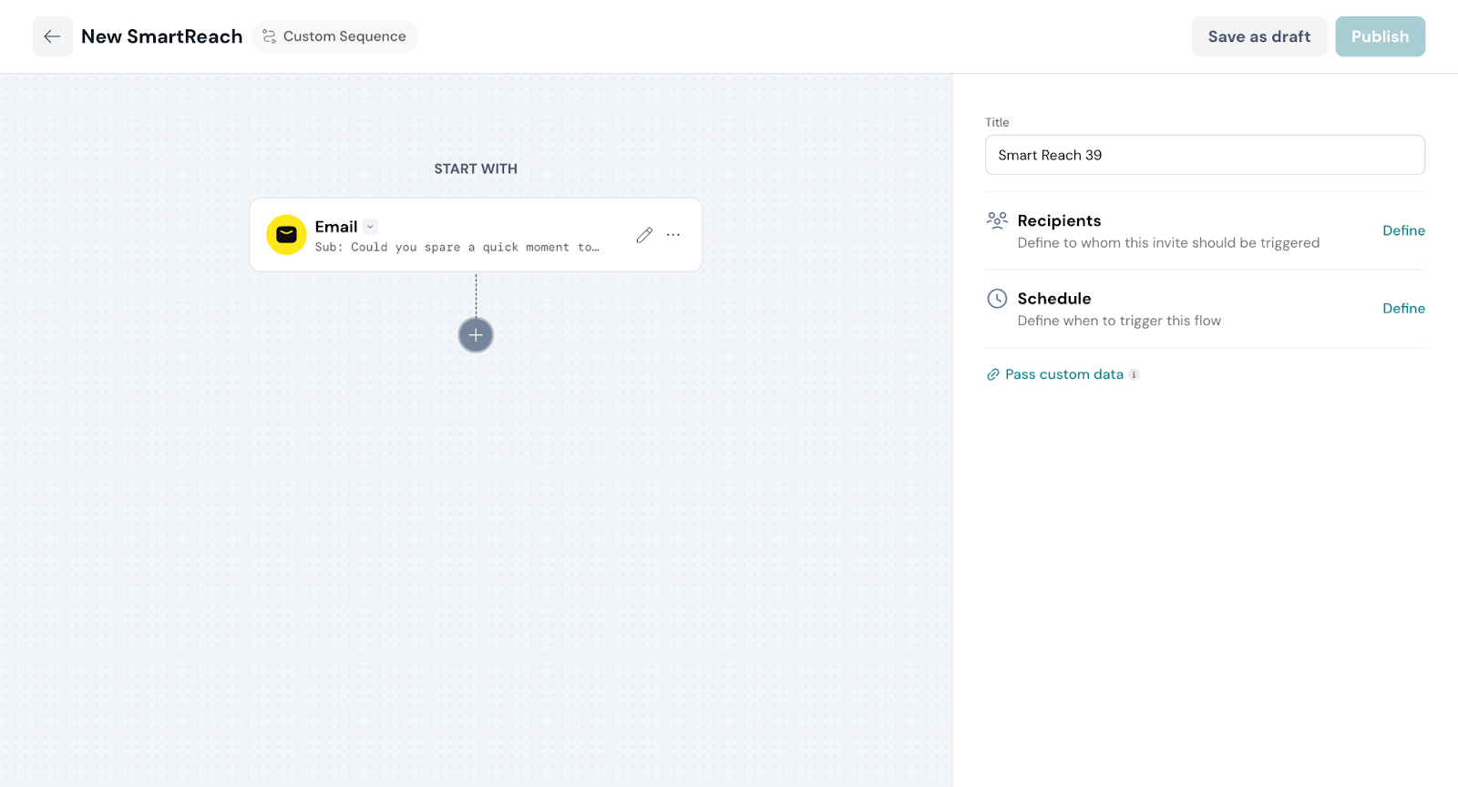 - Custom Sequence- Custom Sequence lets you build personalized outreach flows using a visual drag-and-drop builder. You control the timing, order, and channels and is suited for tailored, rule-based campaigns.