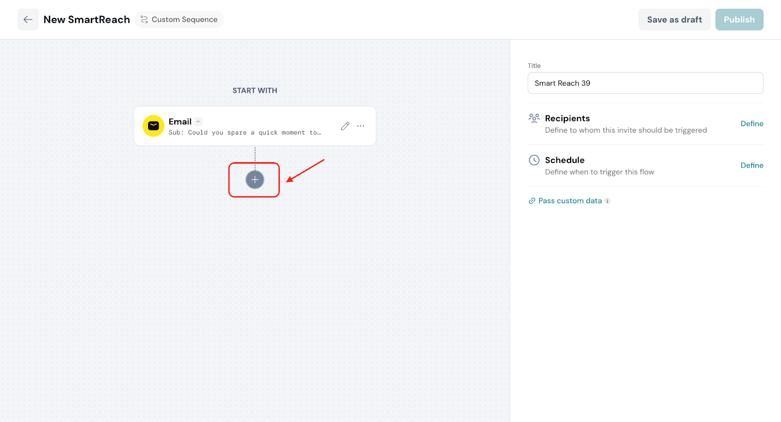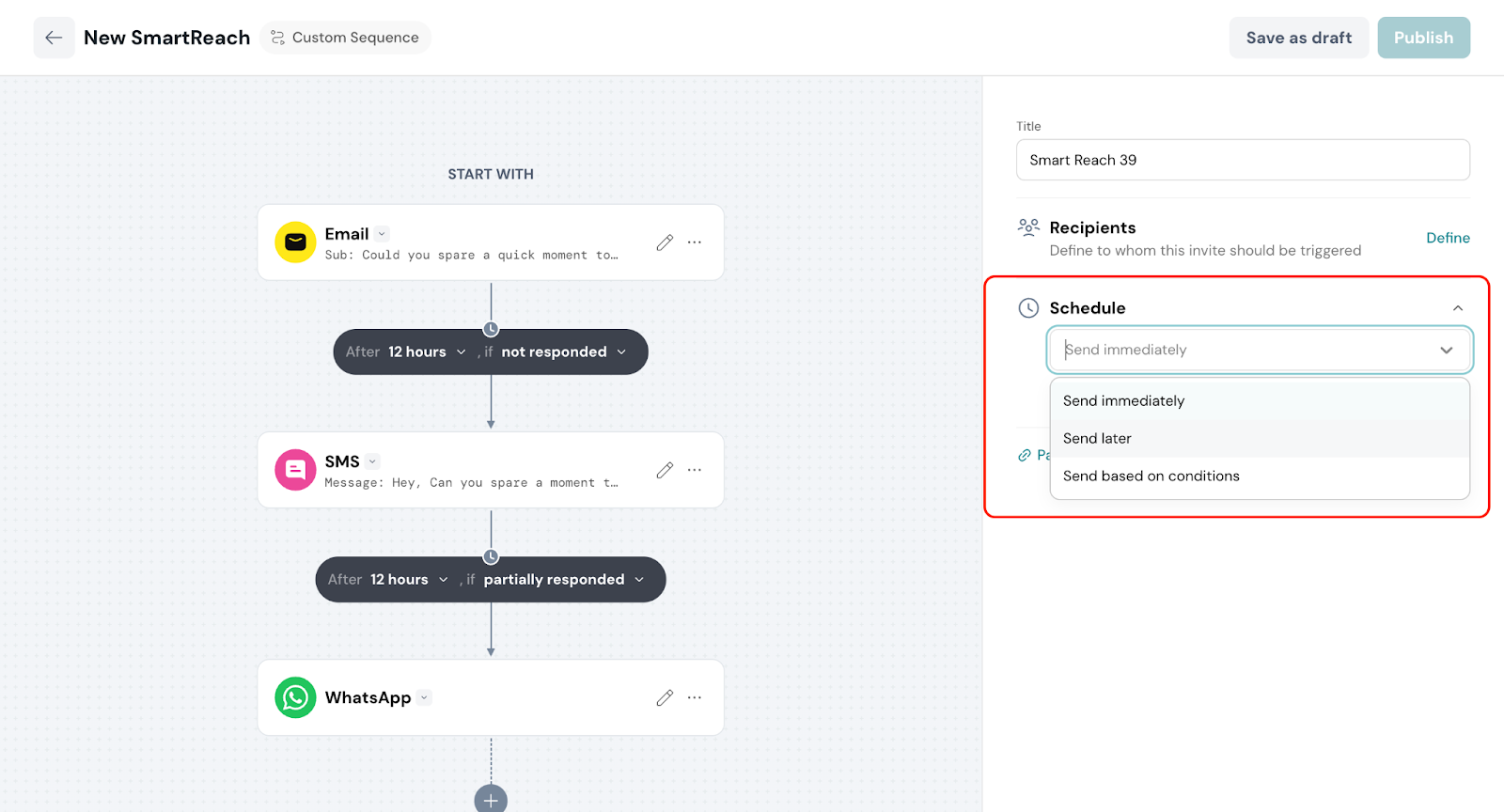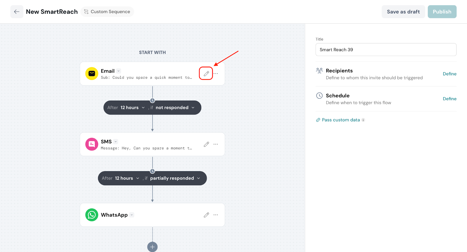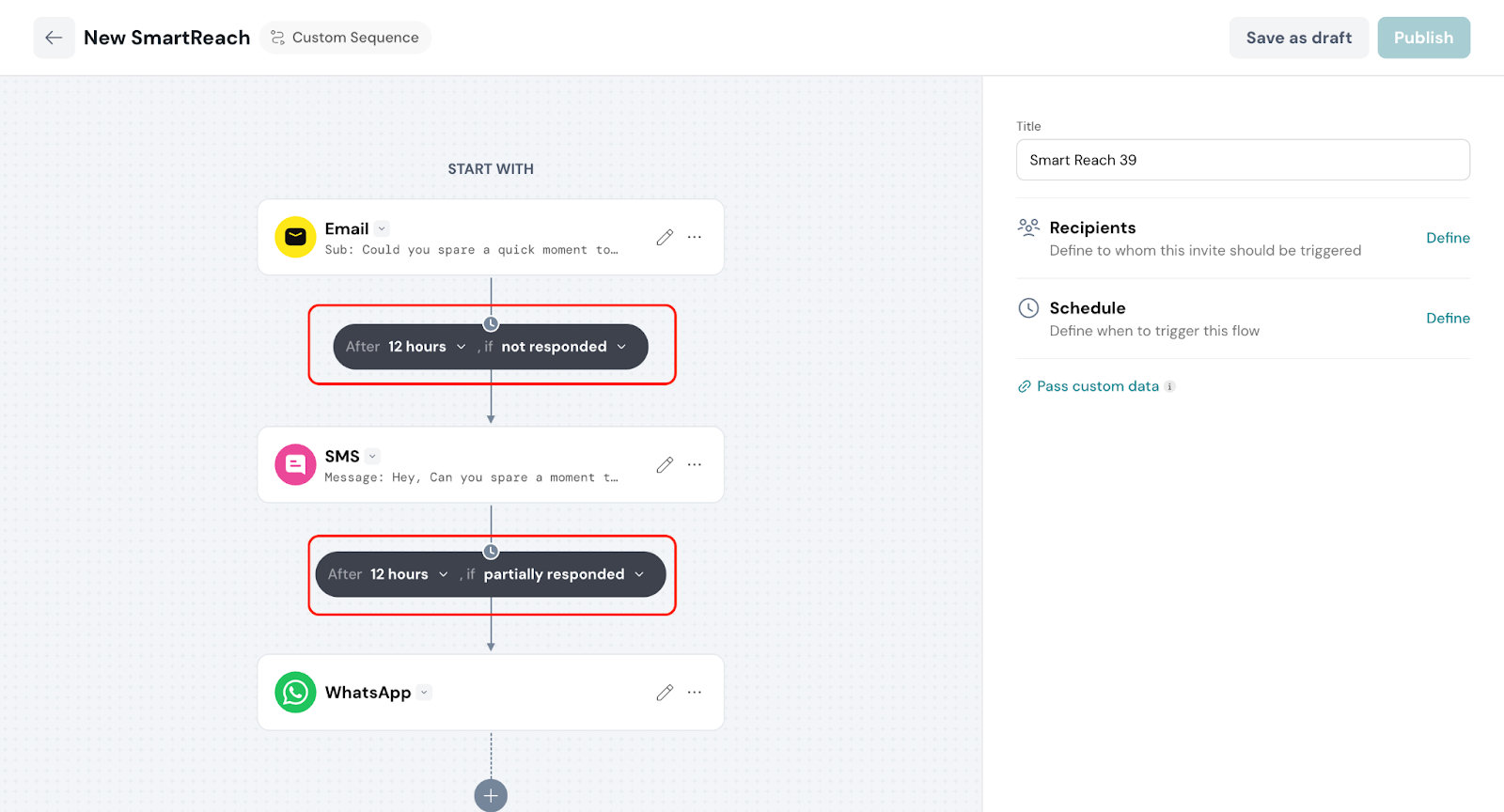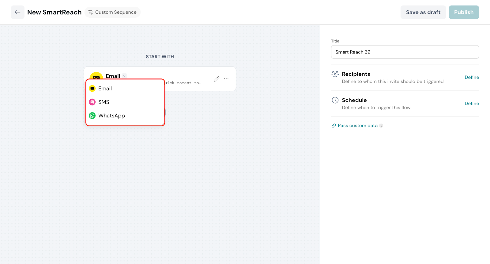 - In Custom Sequence, the default starting point is Email, but you have the flexibility to switch to SMS or WhatsApp as your initial channel. This allows you to tailor the outreach journey based on your campaign strategy or audience preferences.
