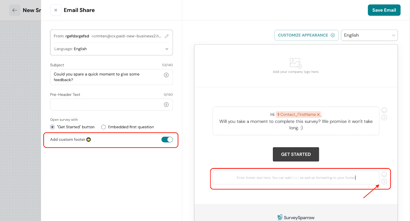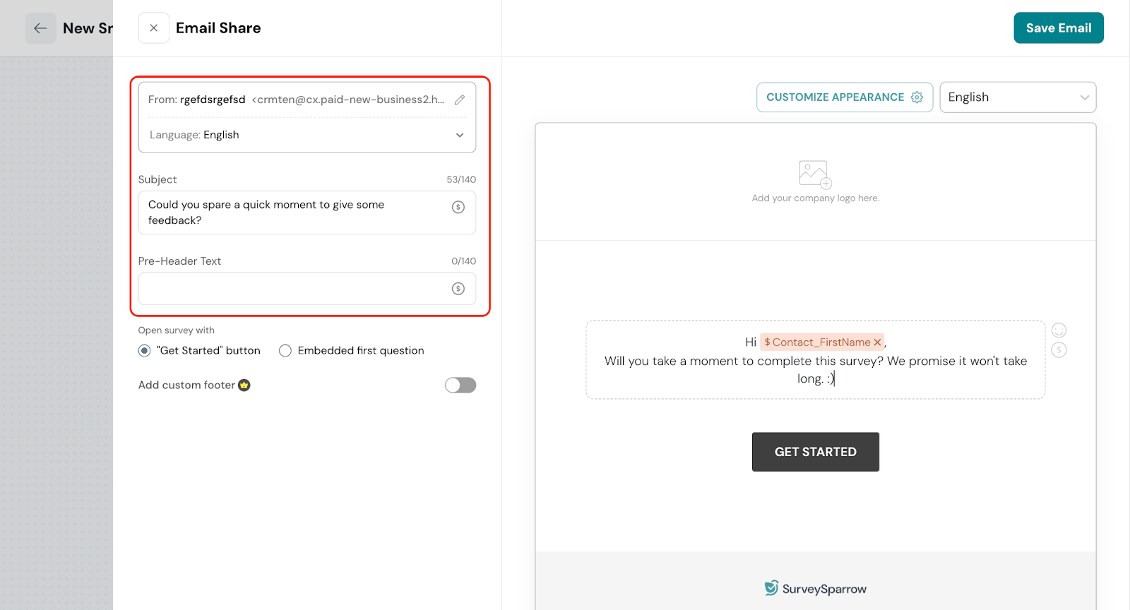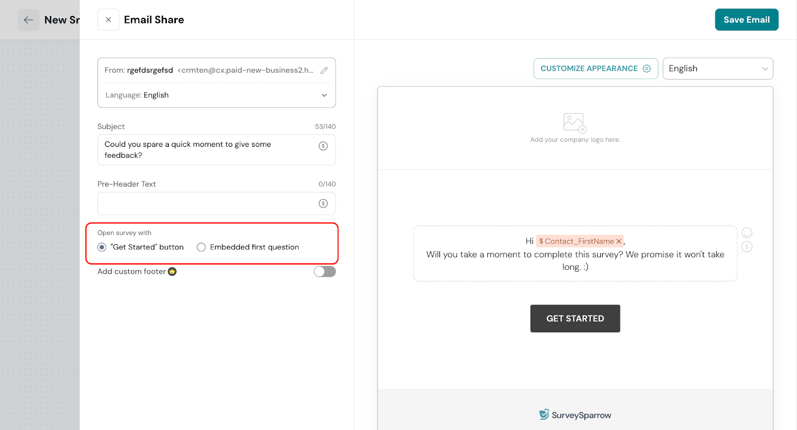 Additionally, you can choose how the survey begins: either by using a "Get Started" button or by embedding the first question directly in the email. This helps you create a more engaging experience for the recipient.