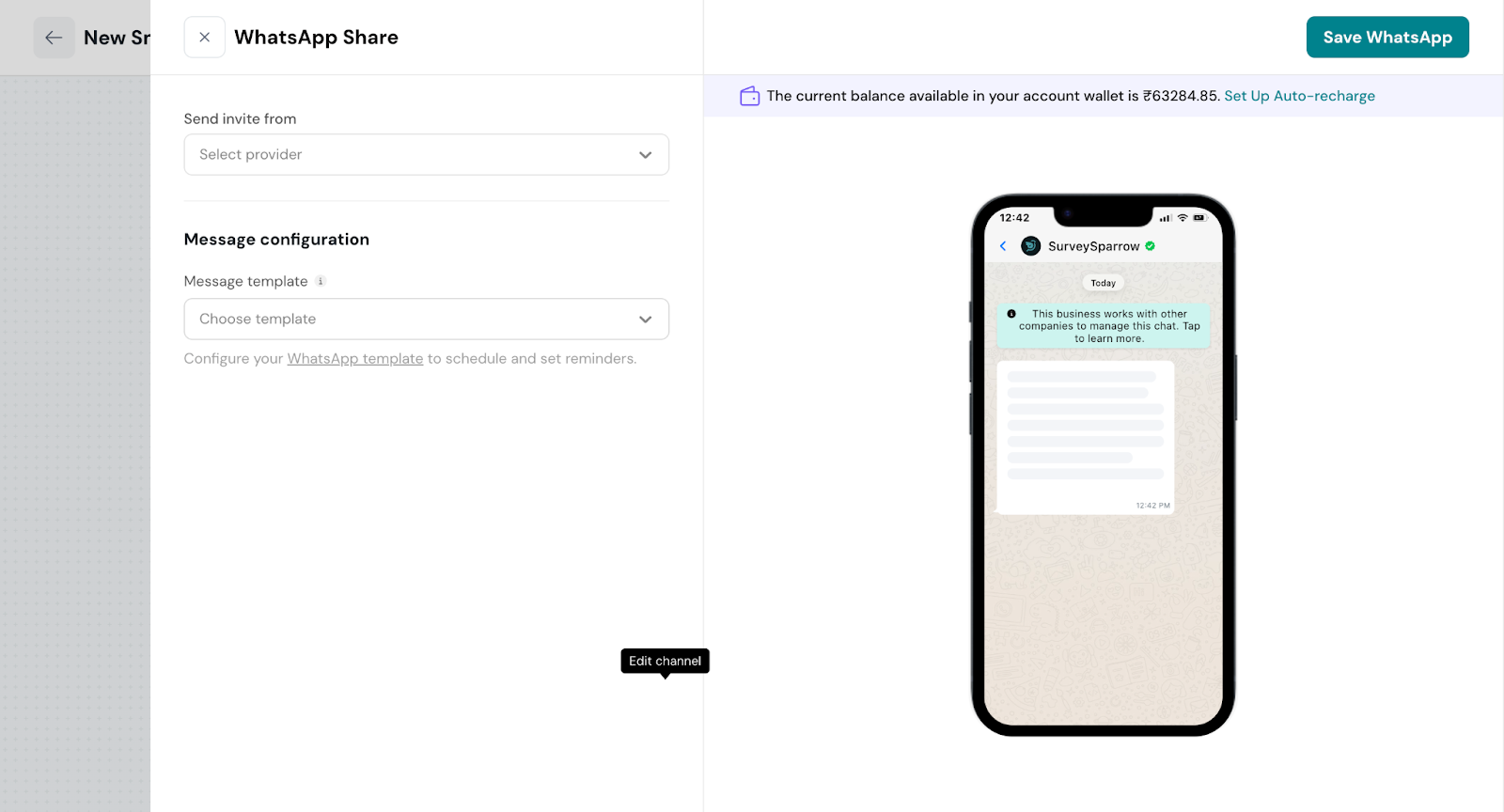 4. Choose WhatsApp:To configure WhatsApp as a channel, select a provider and choose a template. For more on templates, refer to this article on WhatsApp Templates.