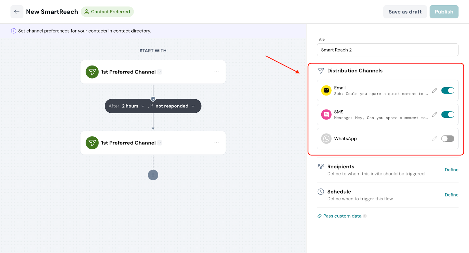 2. Choose the Distribution Channel: You can select one or more channels—Email, SMS, and WhatsApp. If you choose all three, SmartReach’s AI will determine the optimal channel and time for each recipient. By default, Email is selected.