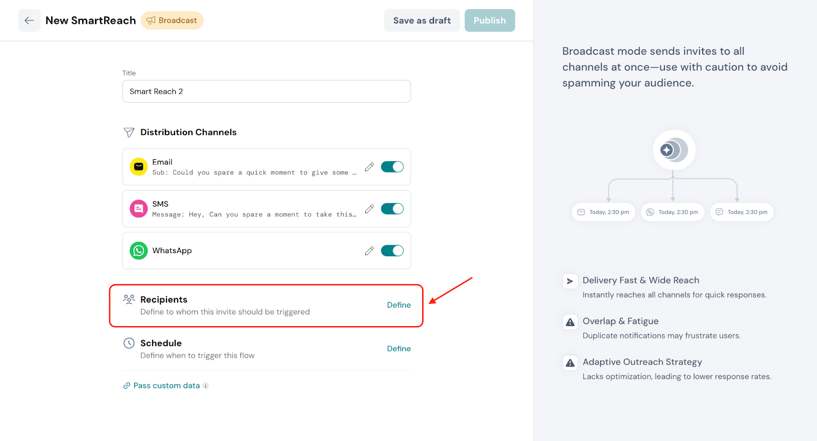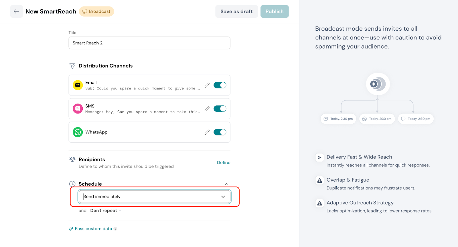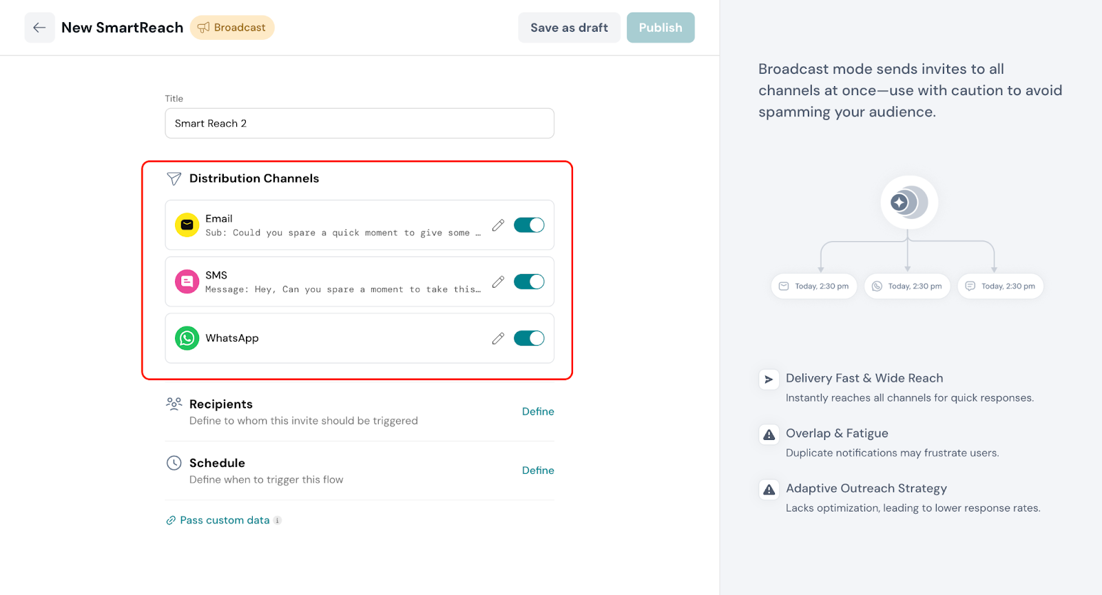 Broadcast-Broadcast sends surveys across all selected channels at once for maximum reach and quick responses. Best for urgent outreach, but should be used carefully to avoid spamming.