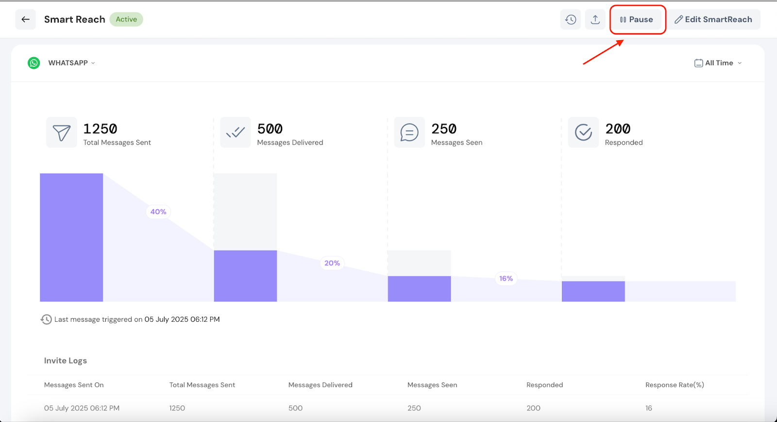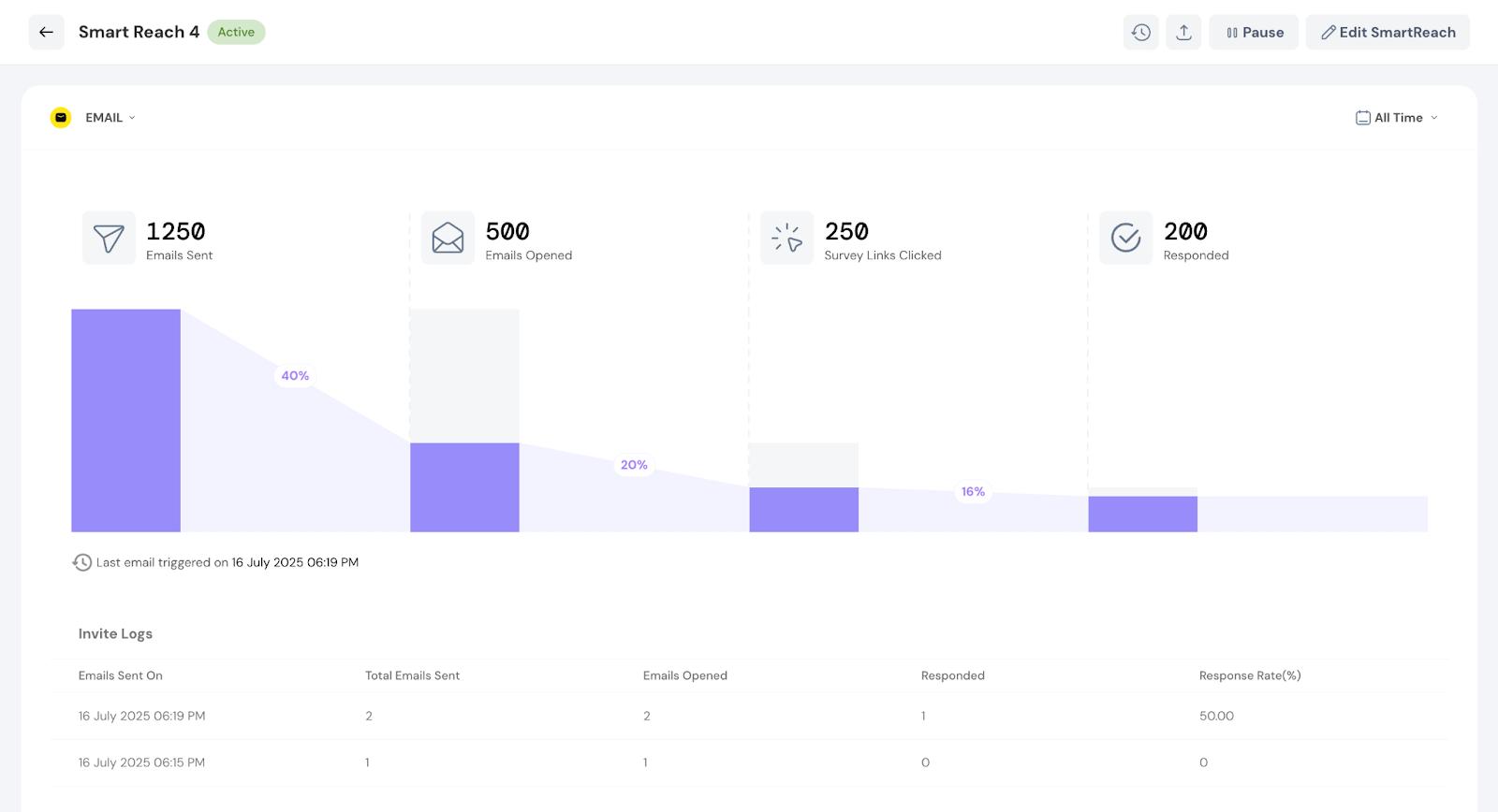 You will be able to pause the SmartReach campaign at any time if you wish to temporarily stop survey distribution.