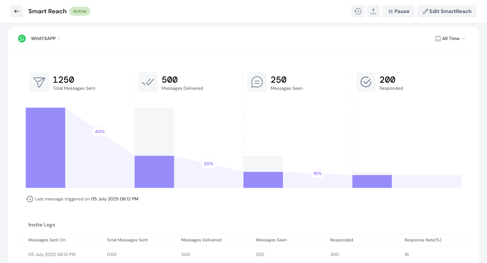 SmartReach’s AI Optimized mode automatically selects the best channel and time based on each contact’s behavior. It continuously learns and adapts—ideal for large-scale, recurring campaigns.