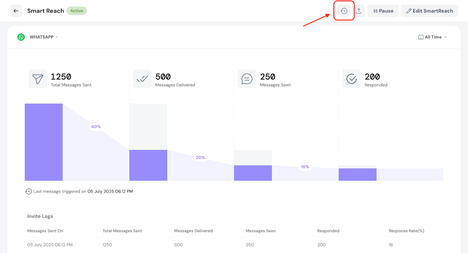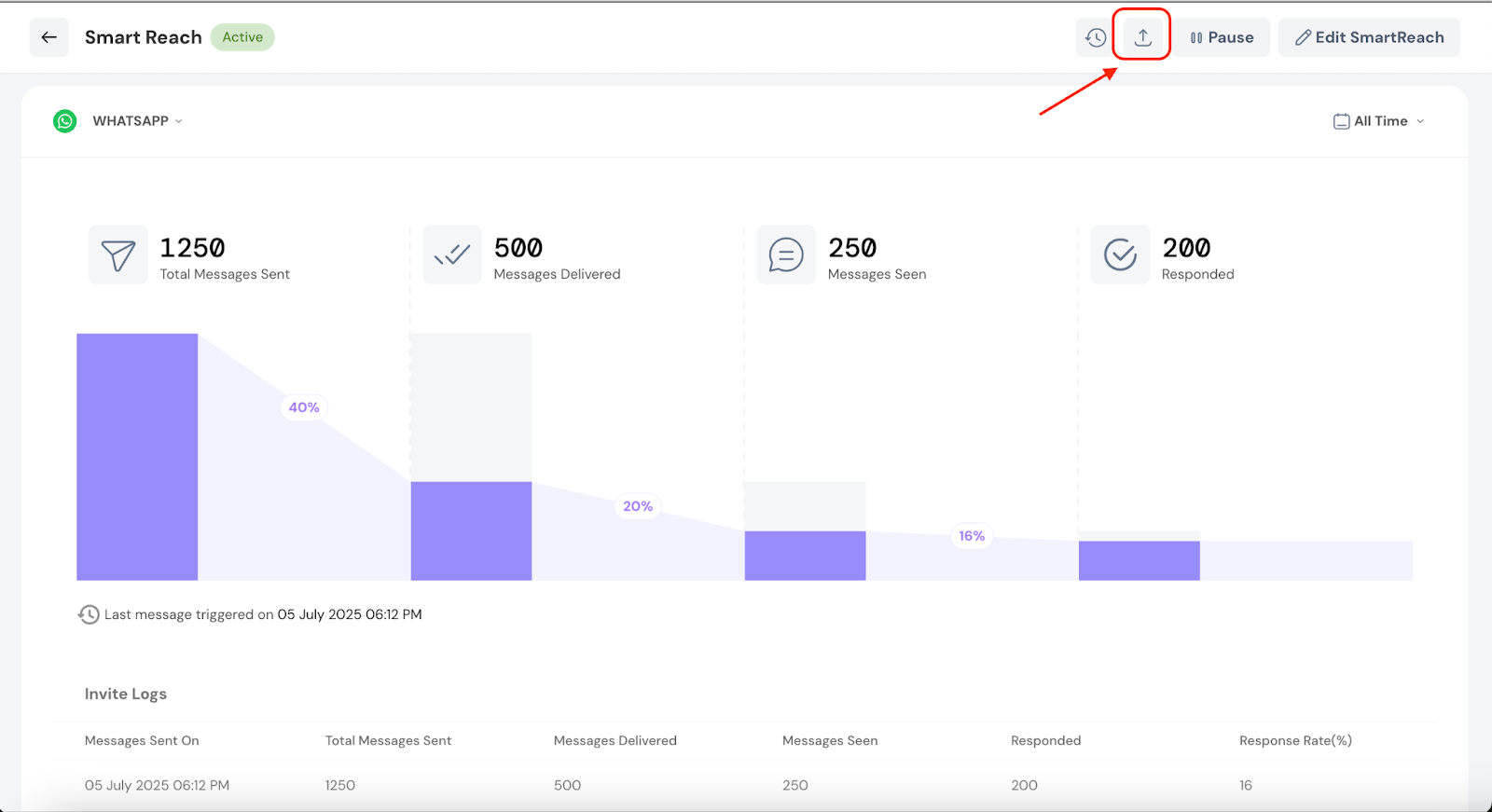Additionally, you can access invite logs below the chart, which display detailed, date-wise information including emails sent, opens, responses, and response rate (%).