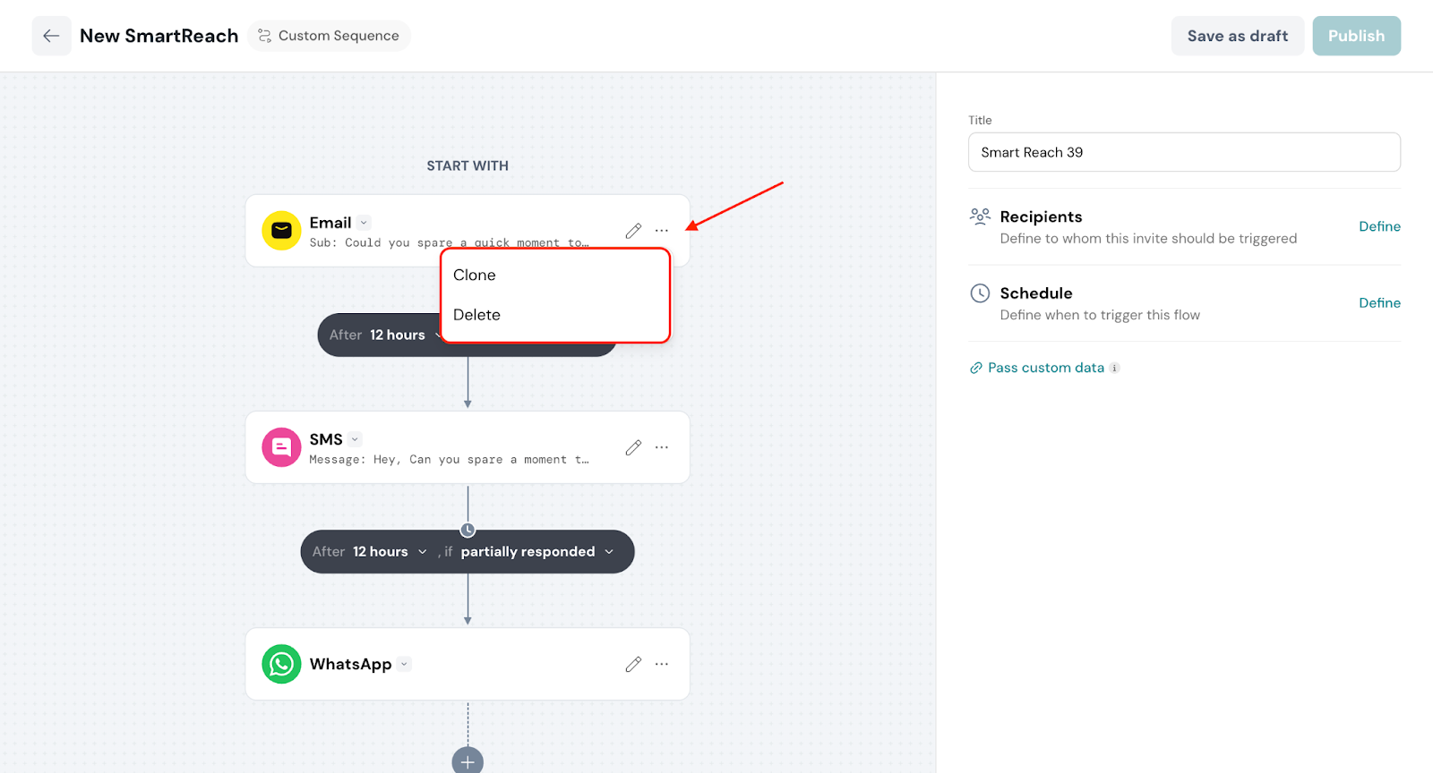 5. You can use the three-dot menu next to each trigger to either clone the step for reuse or delete it if it's no longer needed. This helps you manage and adjust your sequence efficiently.