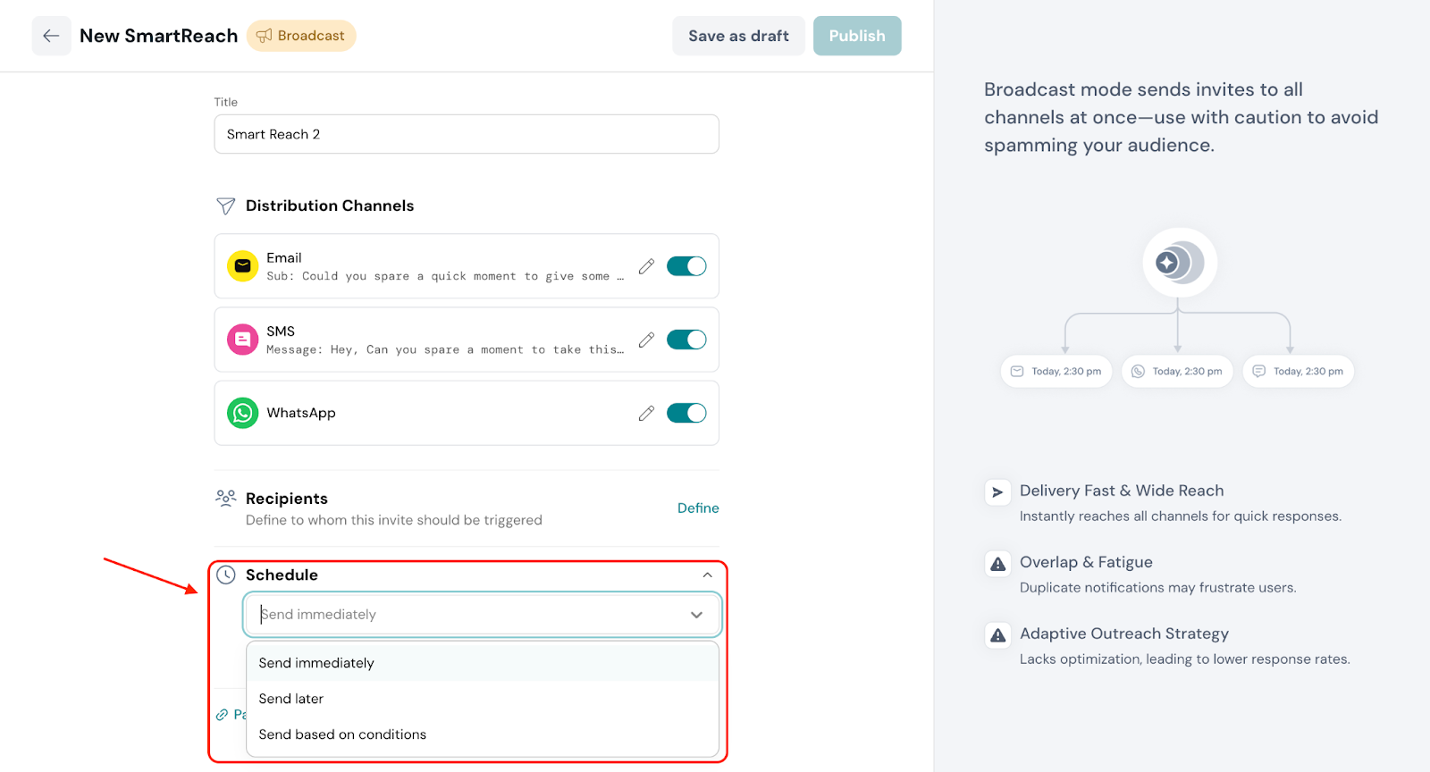 - Schedule- You will have 3 options under schedule- Send Immediately, Send later, Send based on conditions.