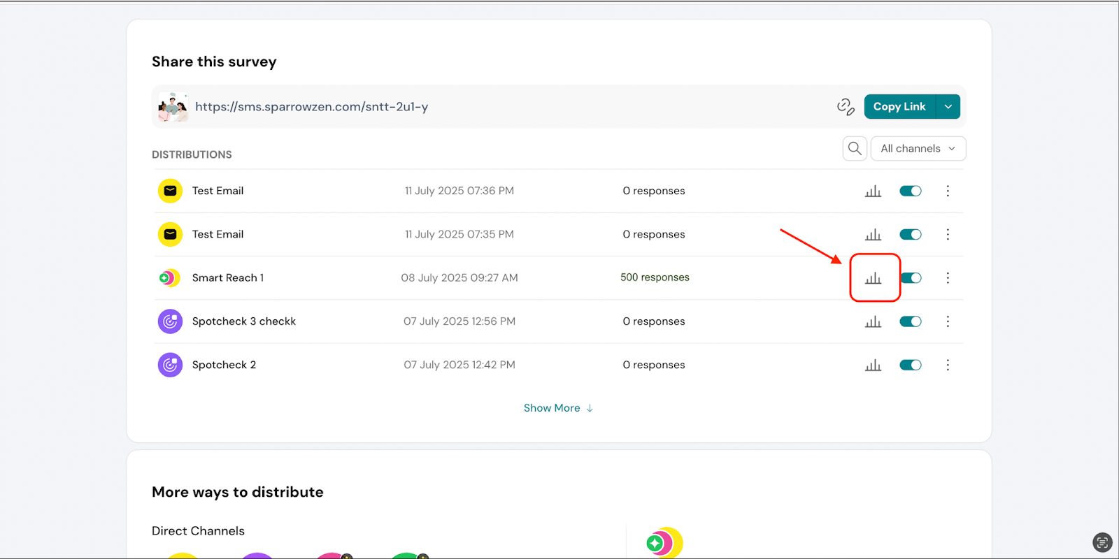 For Email, you’ll be able to view key metrics such as the number of emails sent, opened, survey links clicked, and the number of responses received.