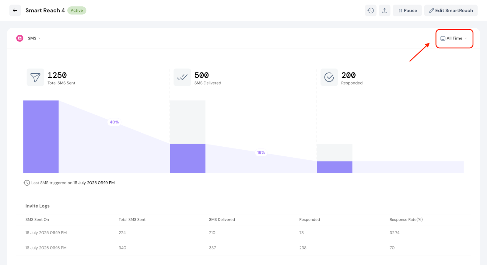 You can also filter the analytics by time, such as last 7 days, last 30 days, or select a custom date range to view SmartReach performance for a specific period.