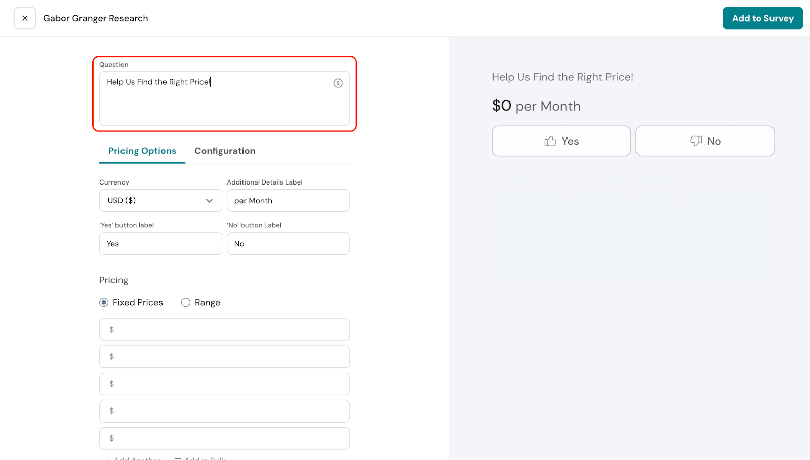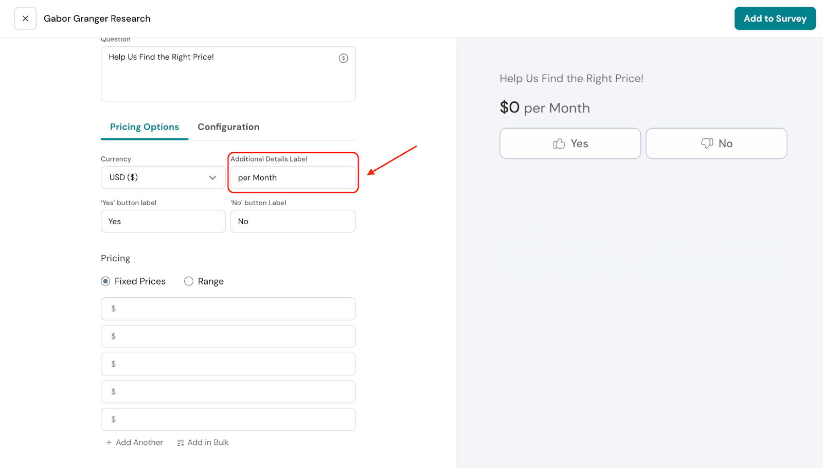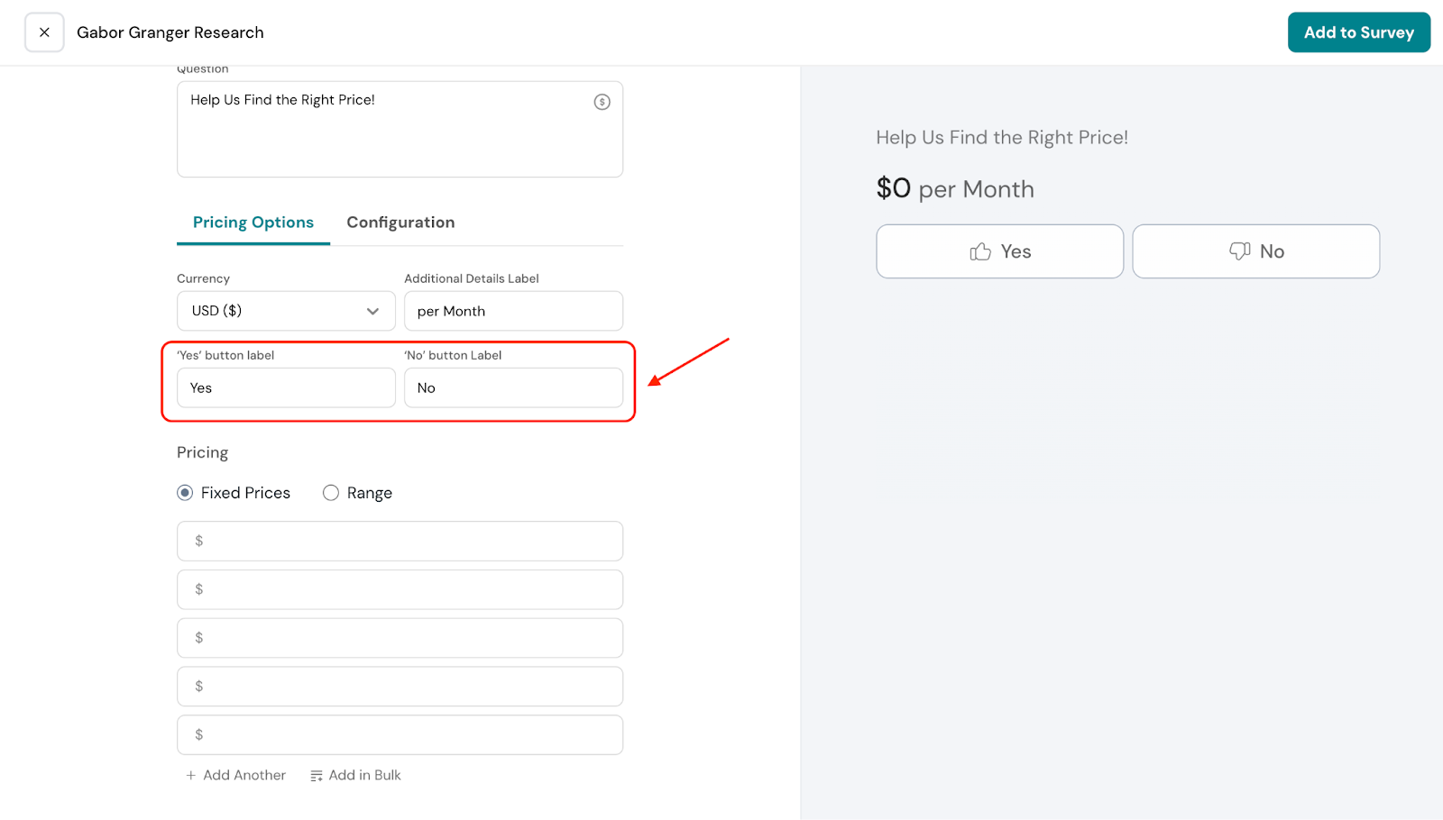 The labels for the pricing options can also be edited. By default, they are set to “Yes” and “No.” When respondents see a price they find acceptable, they select “Yes.” You can customize these labels to better suit your survey.