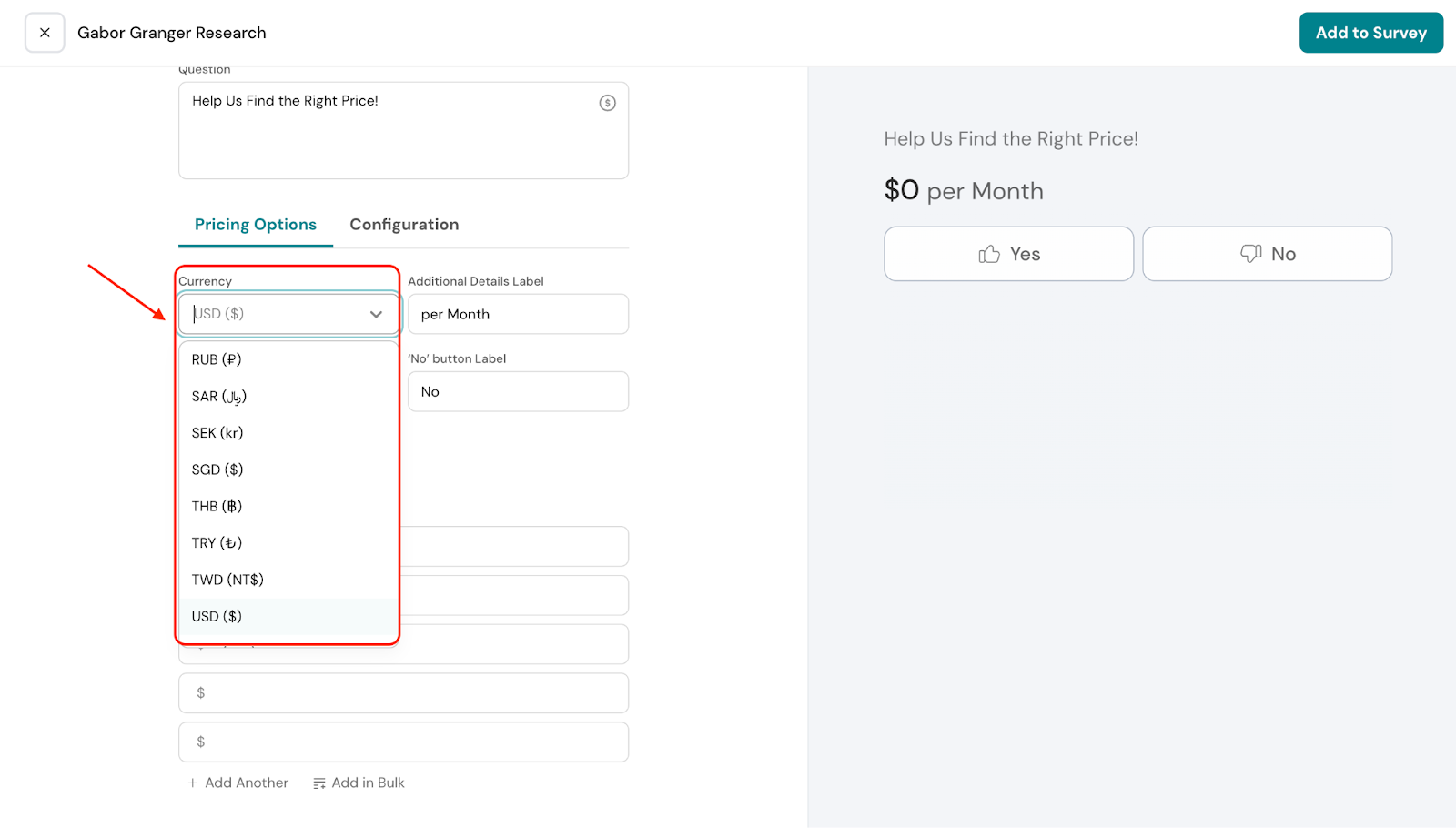 Under Pricing Options, you can select the currency for your survey. This determines how all price points will be displayed to respondents, ensuring clarity and consistency in the results.