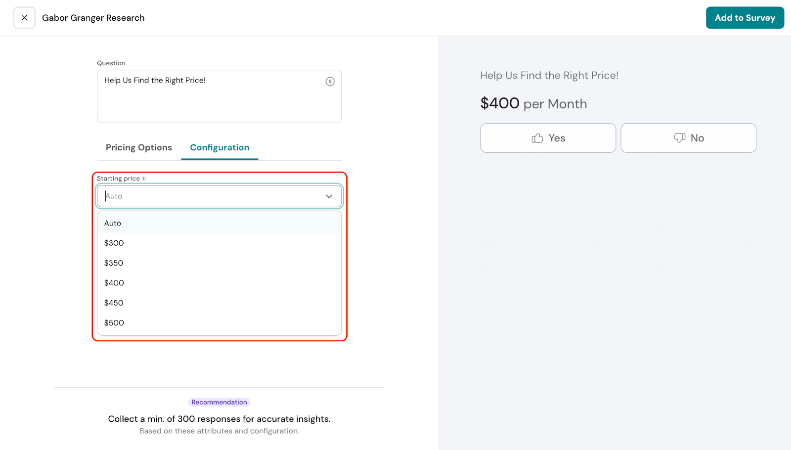 Under Configuration, you can choose the starting price for your survey. You can select a specific price from the dropdown, or choose Auto.