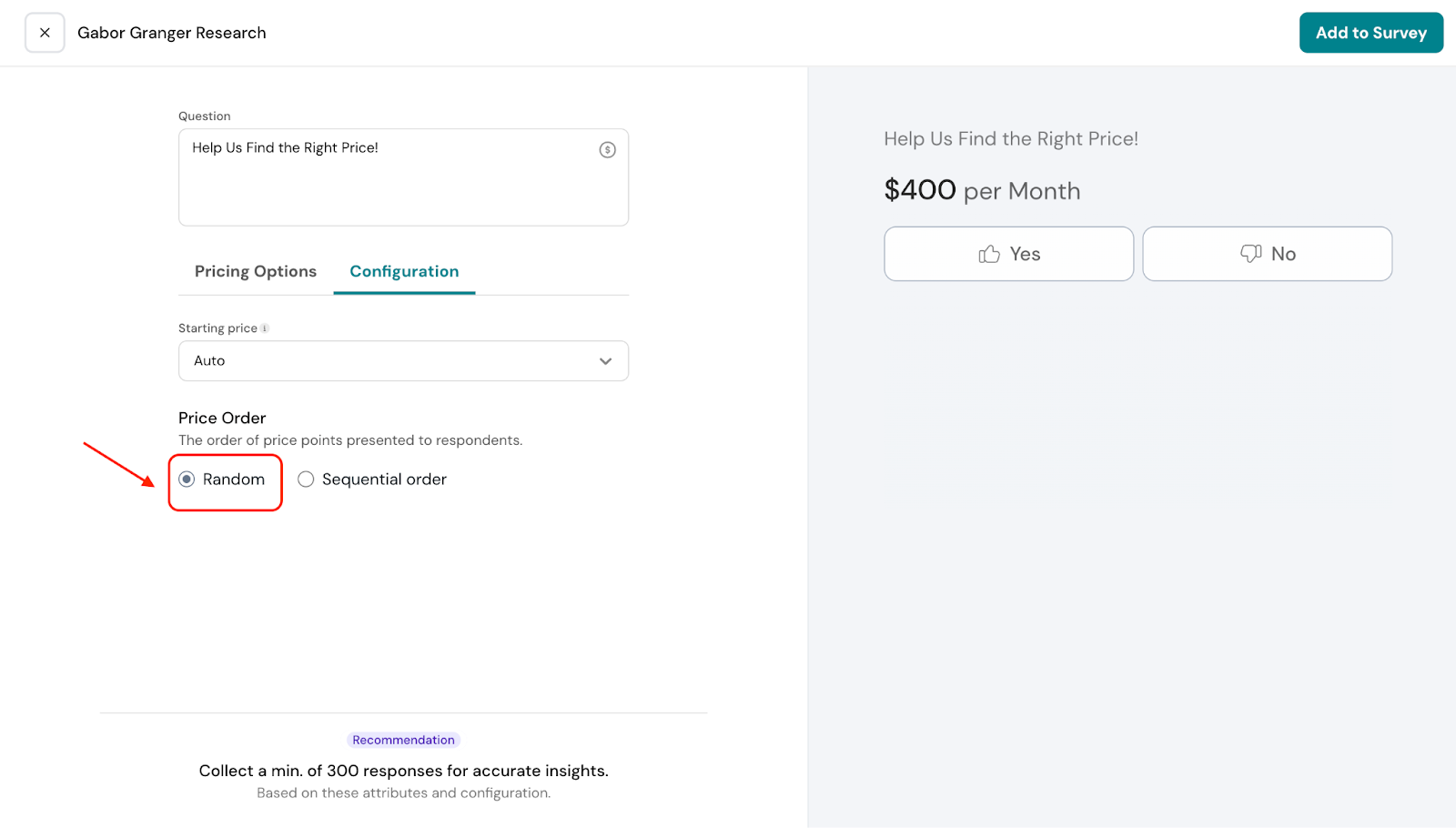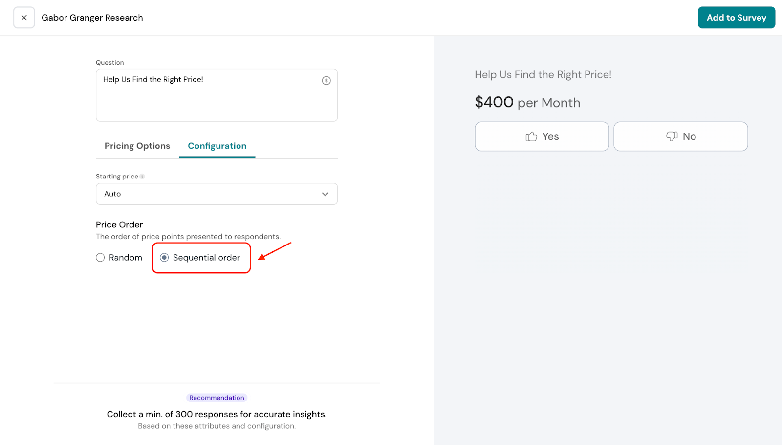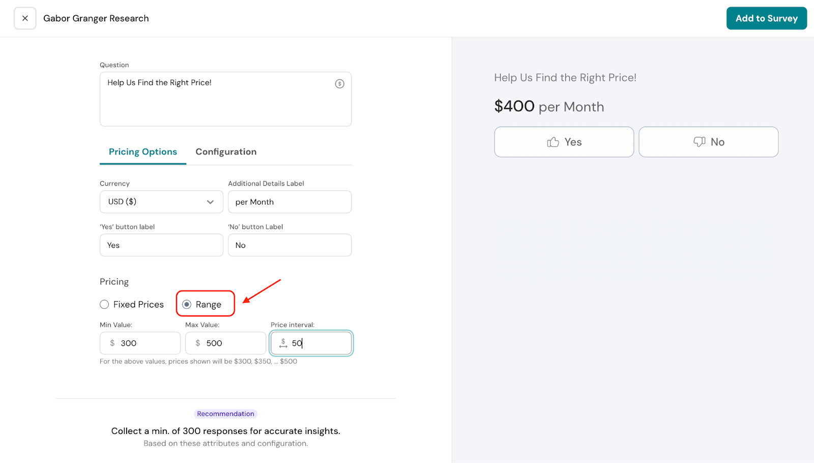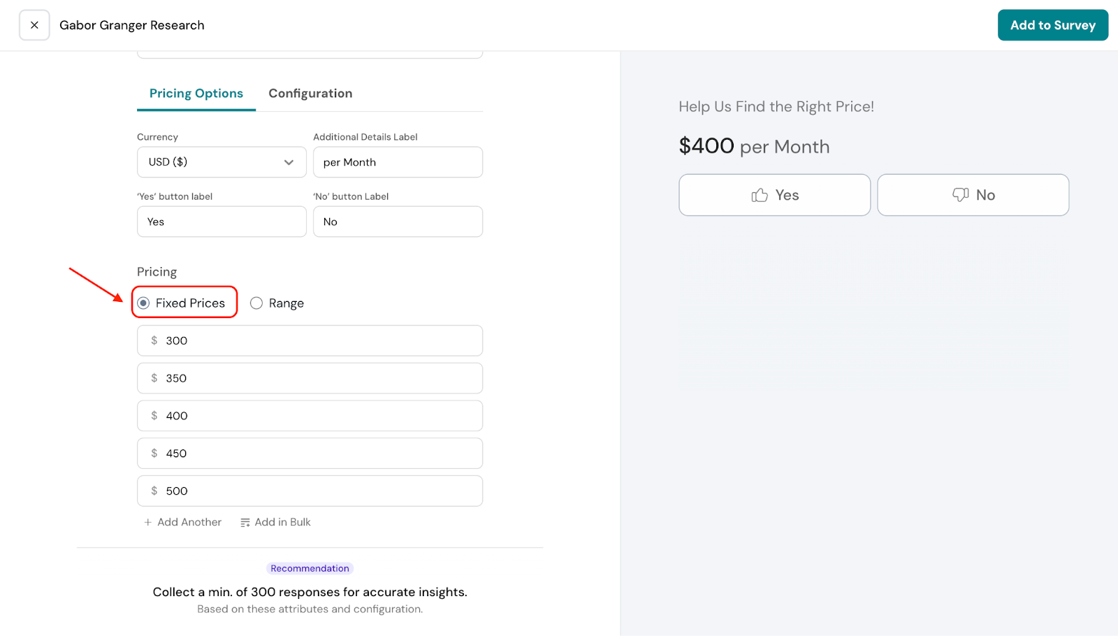 - If the respondent answers “Yes” to $300, the next price shown will be $400, and their response to $400 will be recorded.