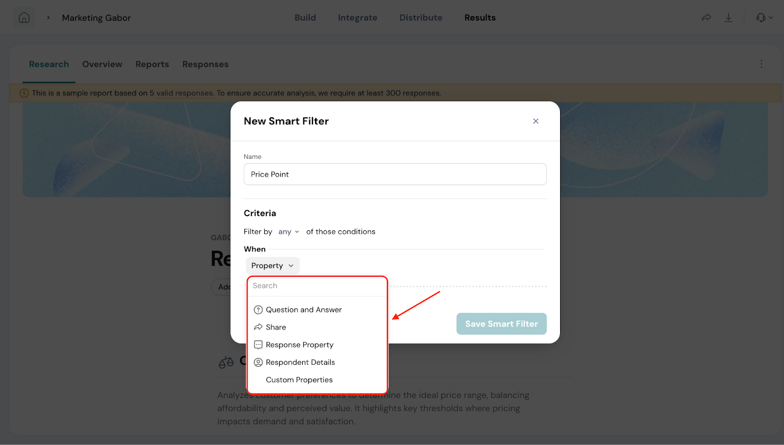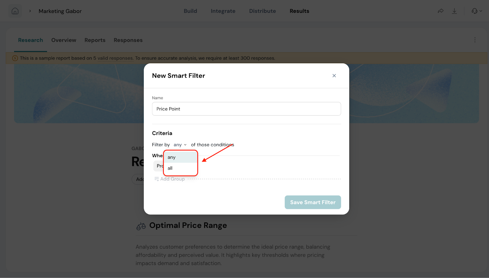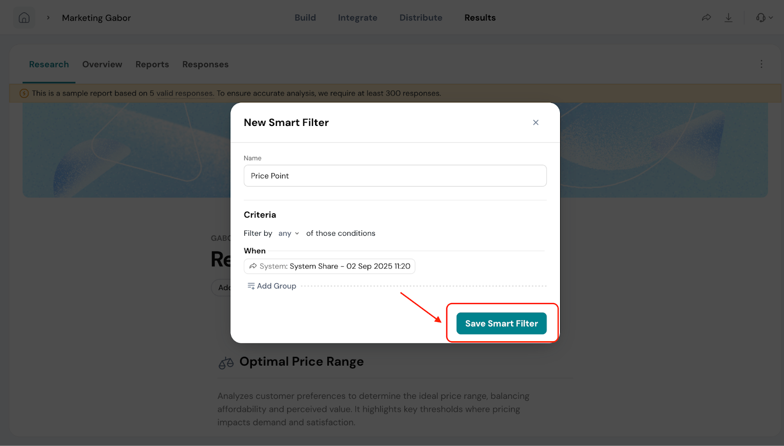 Smart Filters are especially useful when you’ve added extra questions in your Gabor-Granger survey. For example, if you ask respondents about their age group, location, or product usage, you can use a filter to compare pricing preferences between different segments.