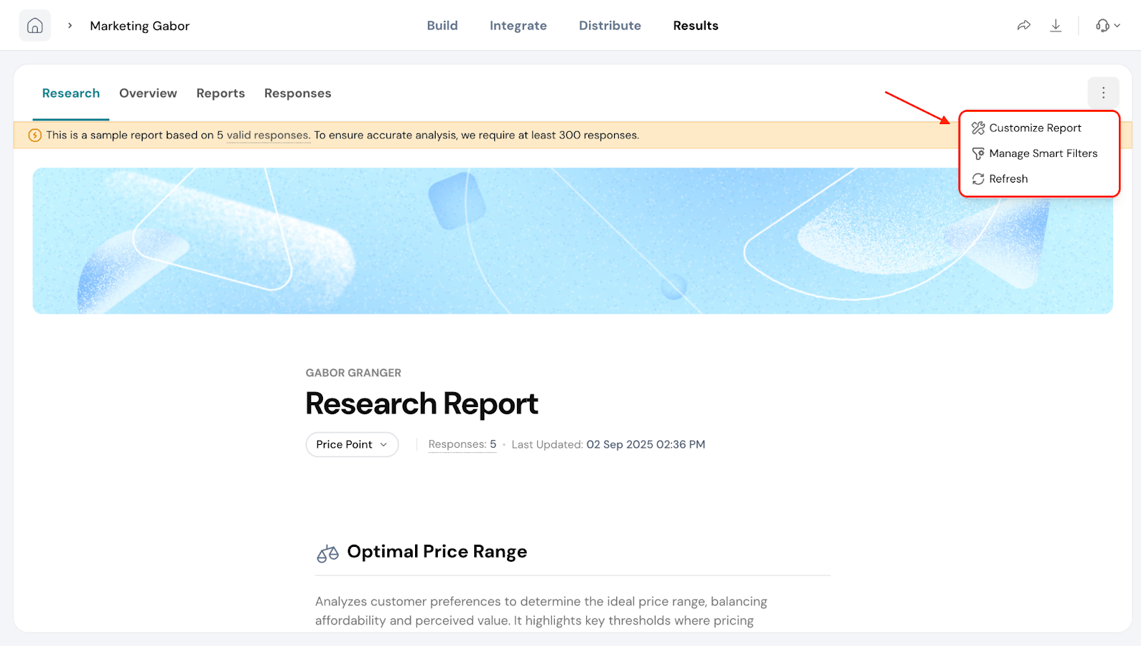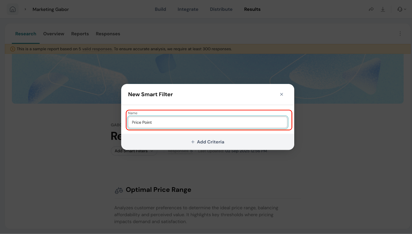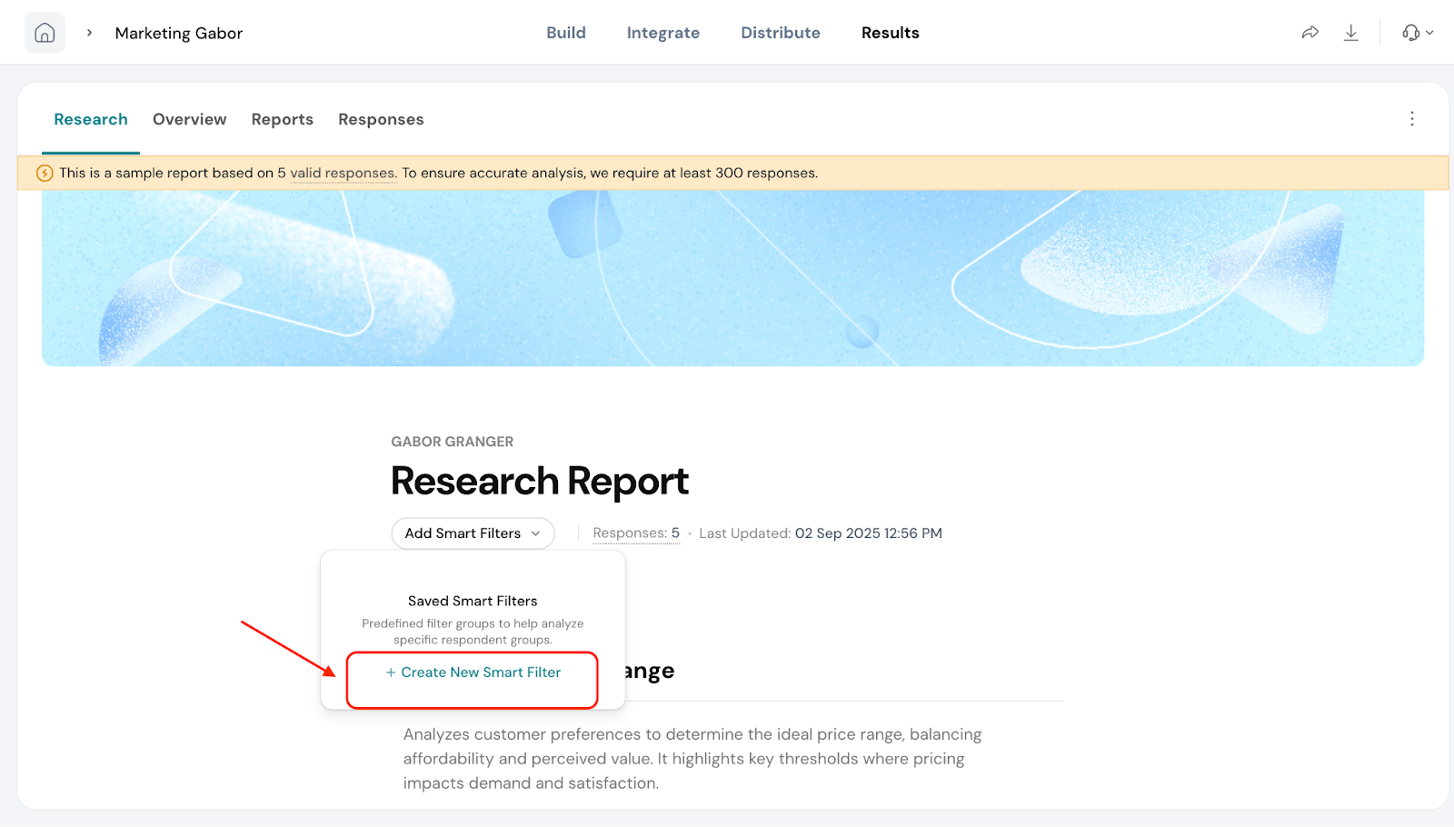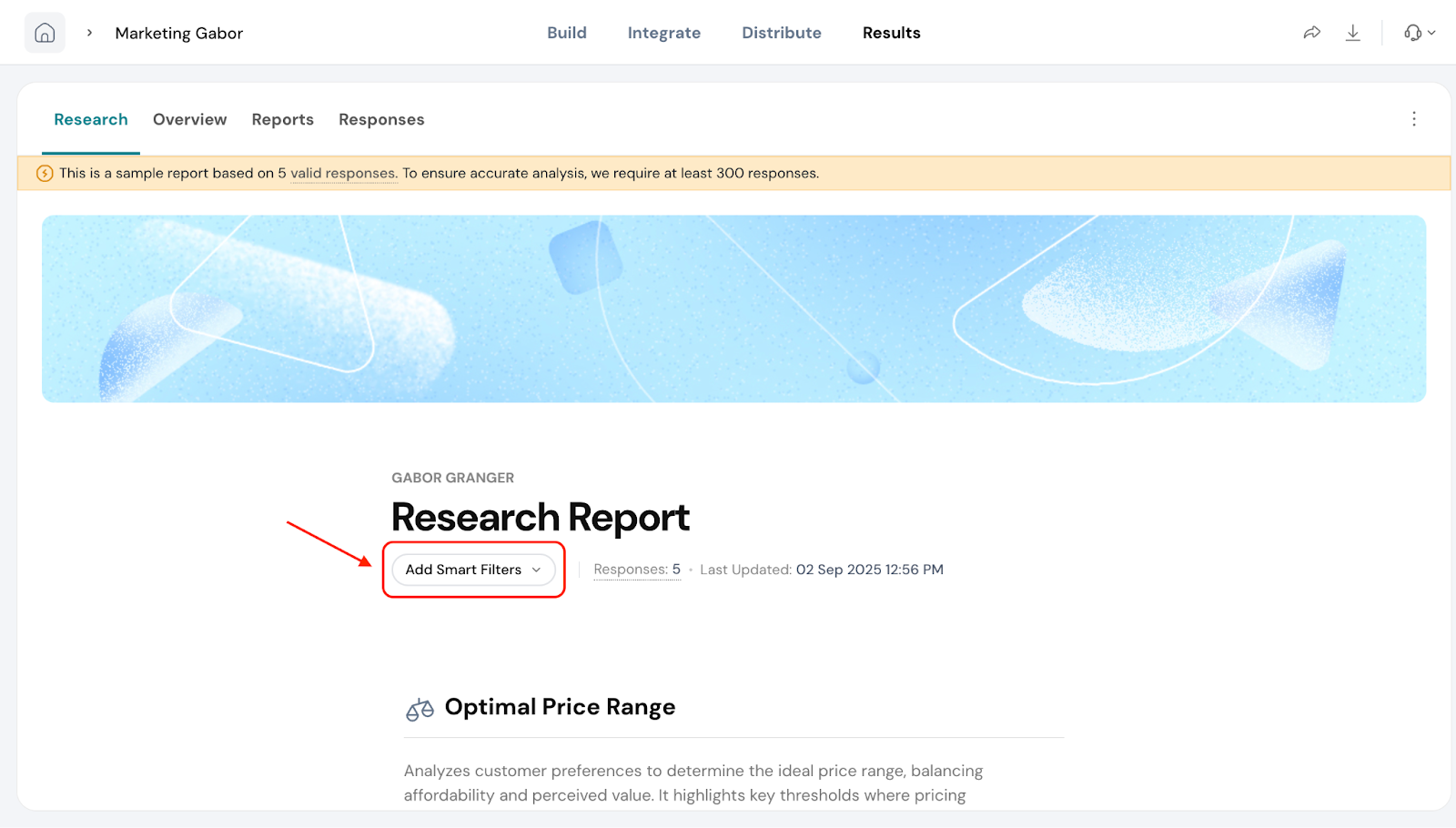Smart Filters are especially useful when you’ve added extra questions in your Gabor-Granger survey. For example, if you ask respondents about their age group, location, or product usage, you can use a filter to compare pricing preferences between different segments.