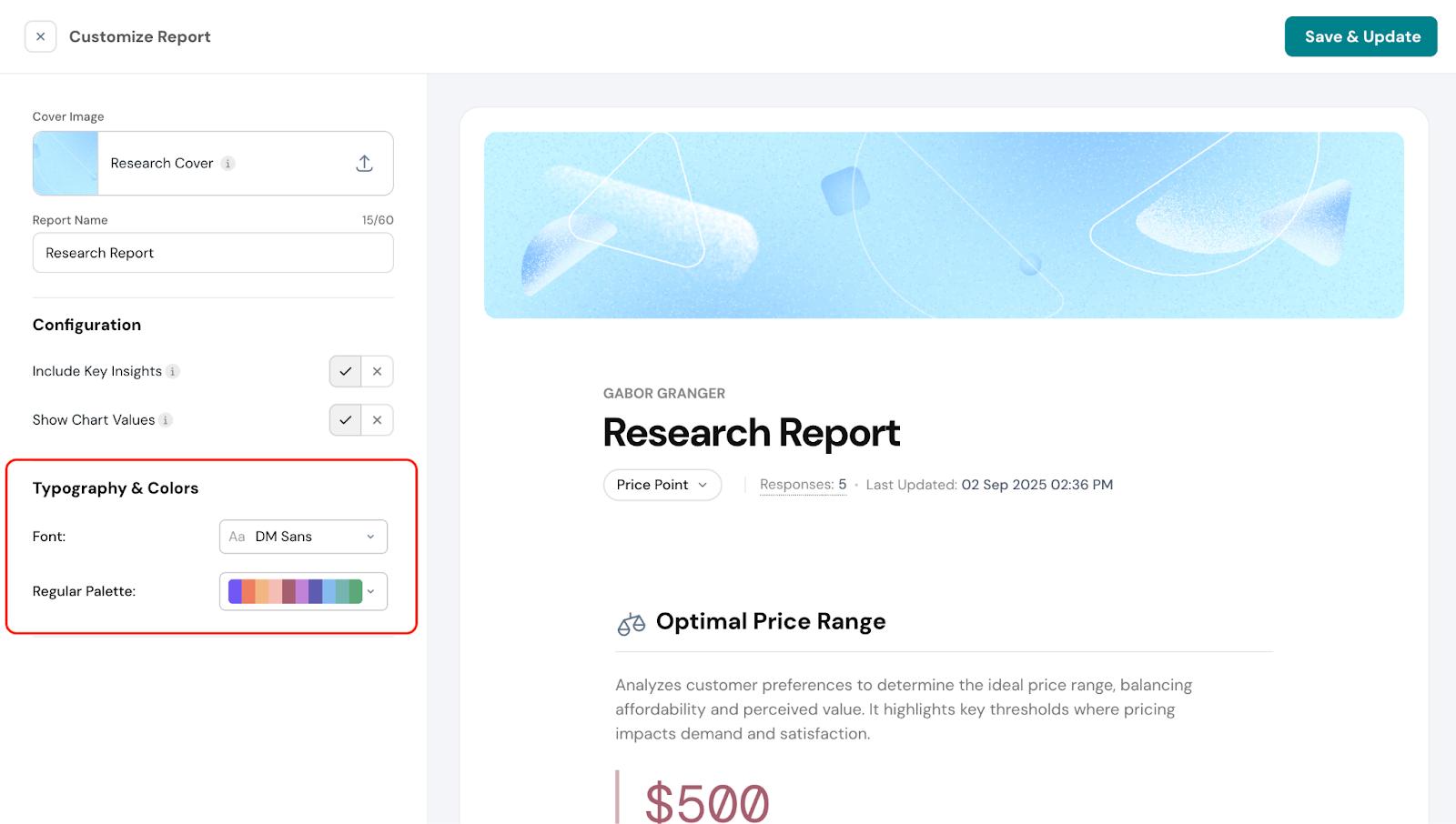 - Customize typography and colors, including changing the font style and chart colors.