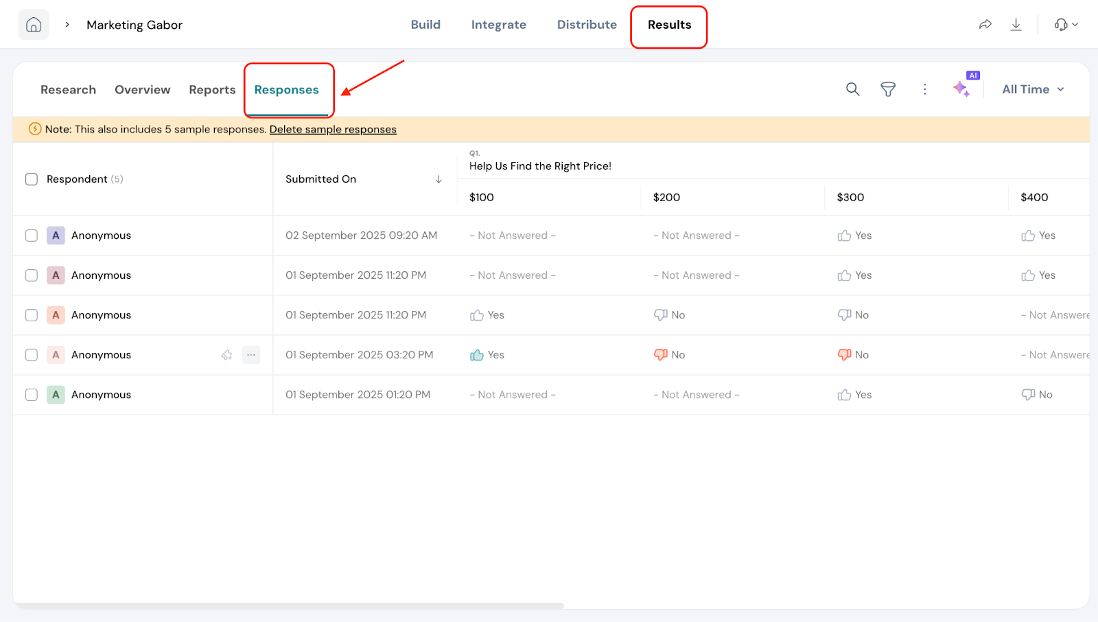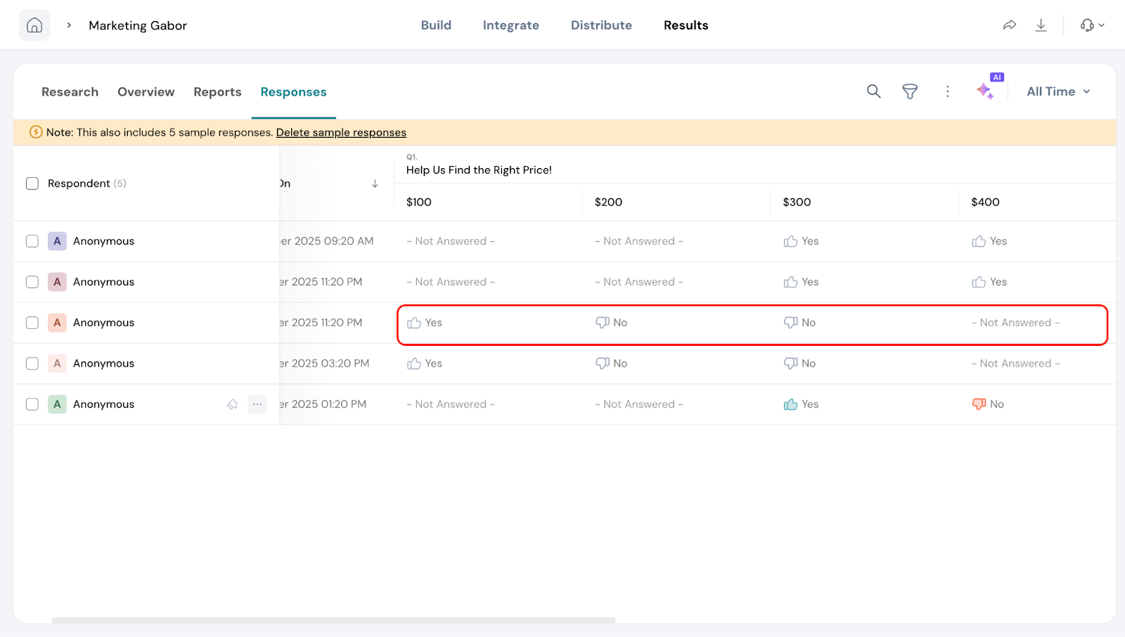3. Not Answered: In some cases, you may see “Not answered” for certain price points. This means that the price was never shown to that respondent based on their previous answers.