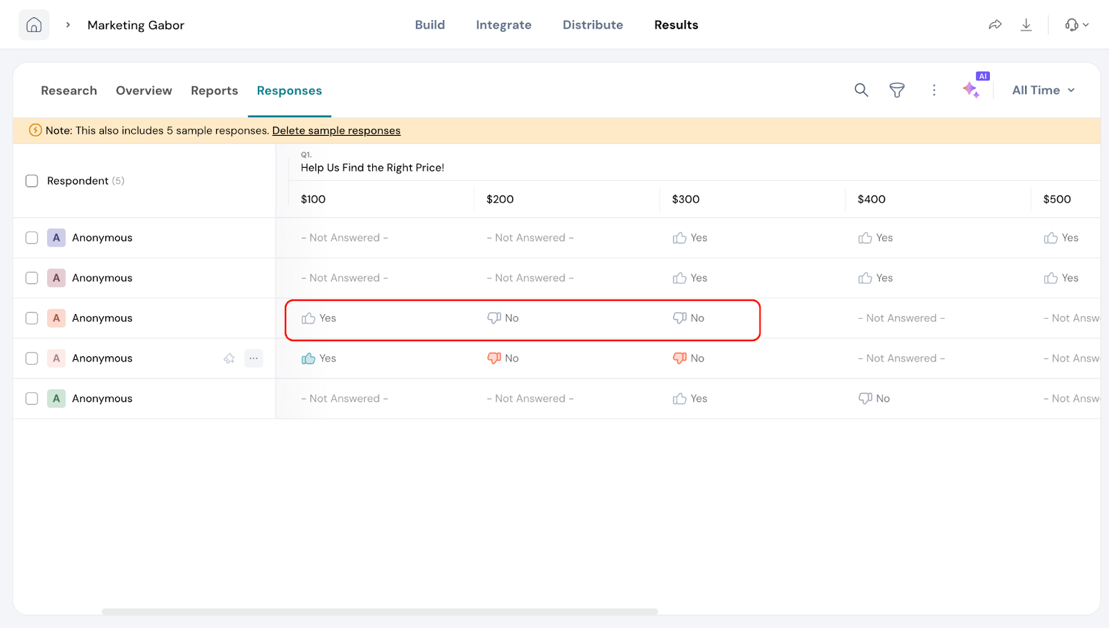 2. Under each price point you can see if the respondent has said yes or no.