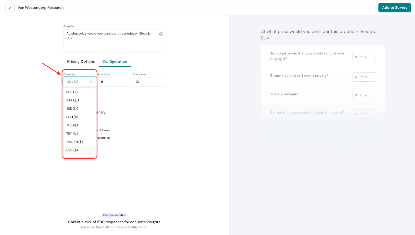 5. Under Configuration, you can choose the currency for your survey. This setting controls how all price points are shown to respondents, helping maintain clarity and consistency throughout the results.