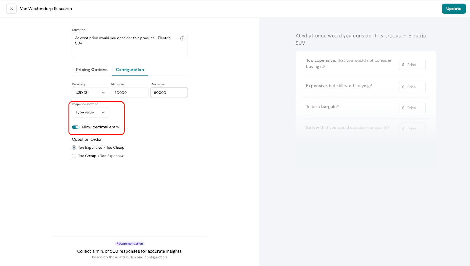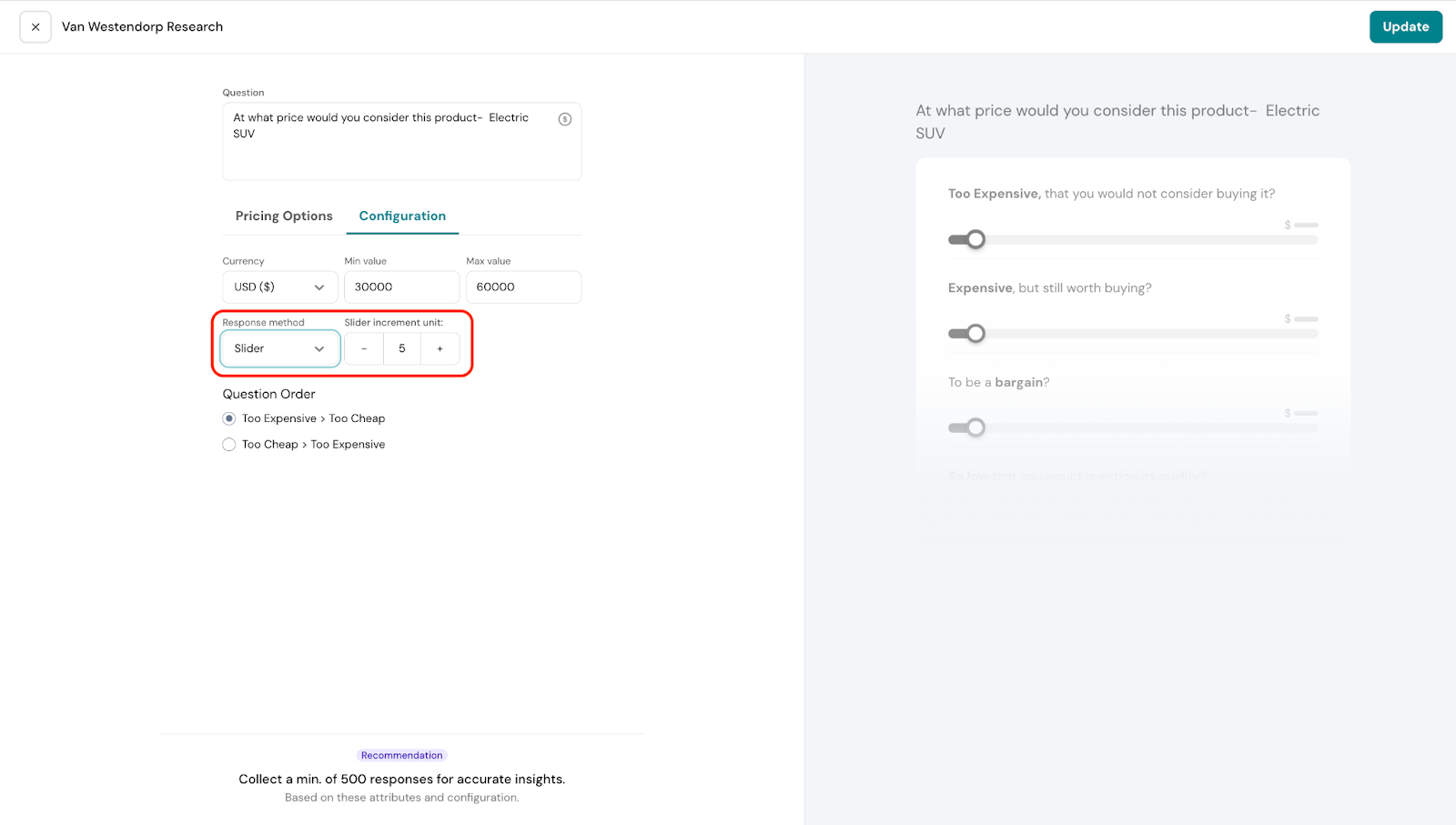 - You can edit the question however you like. By default, it will read: “At what price would you consider this product”