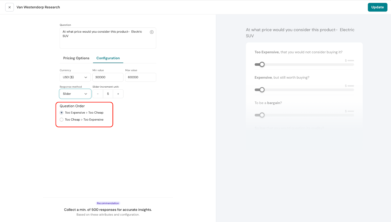 8. Question Order – You can decide the order in which pricing questions appear. For example, you can start by asking about the highest price customers would consider “too expensive” and work your way down to the lowest price they’d see as “too cheap.” Or, you can reverse it by starting with “too cheap” and moving up to “too expensive.” Choose the order that feels most natural for your audience.