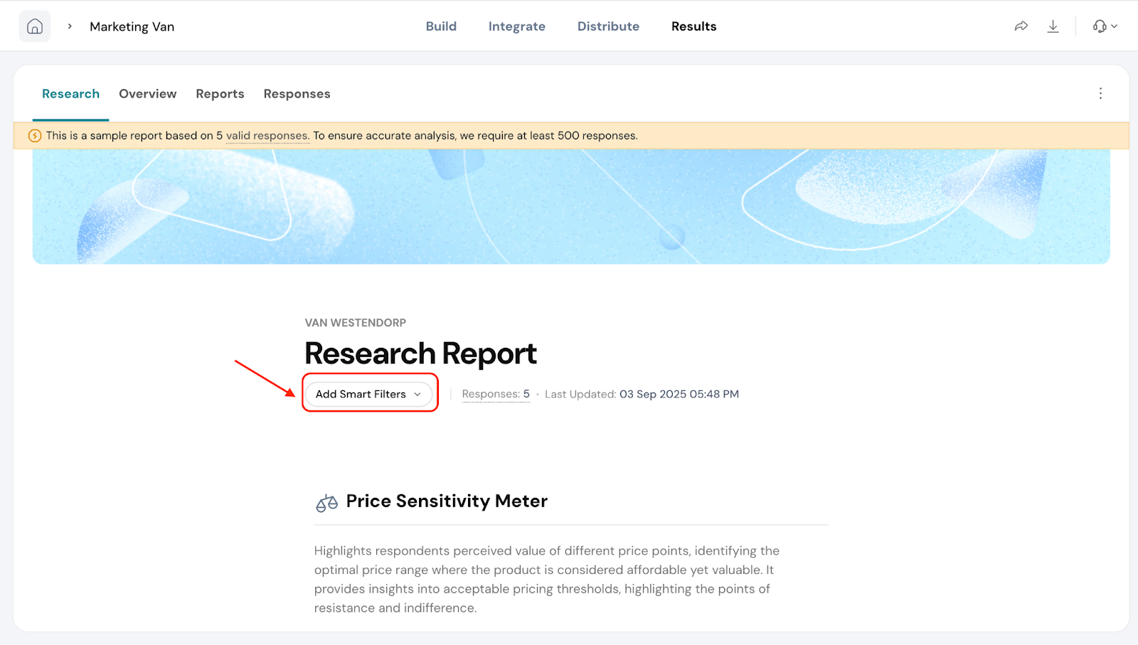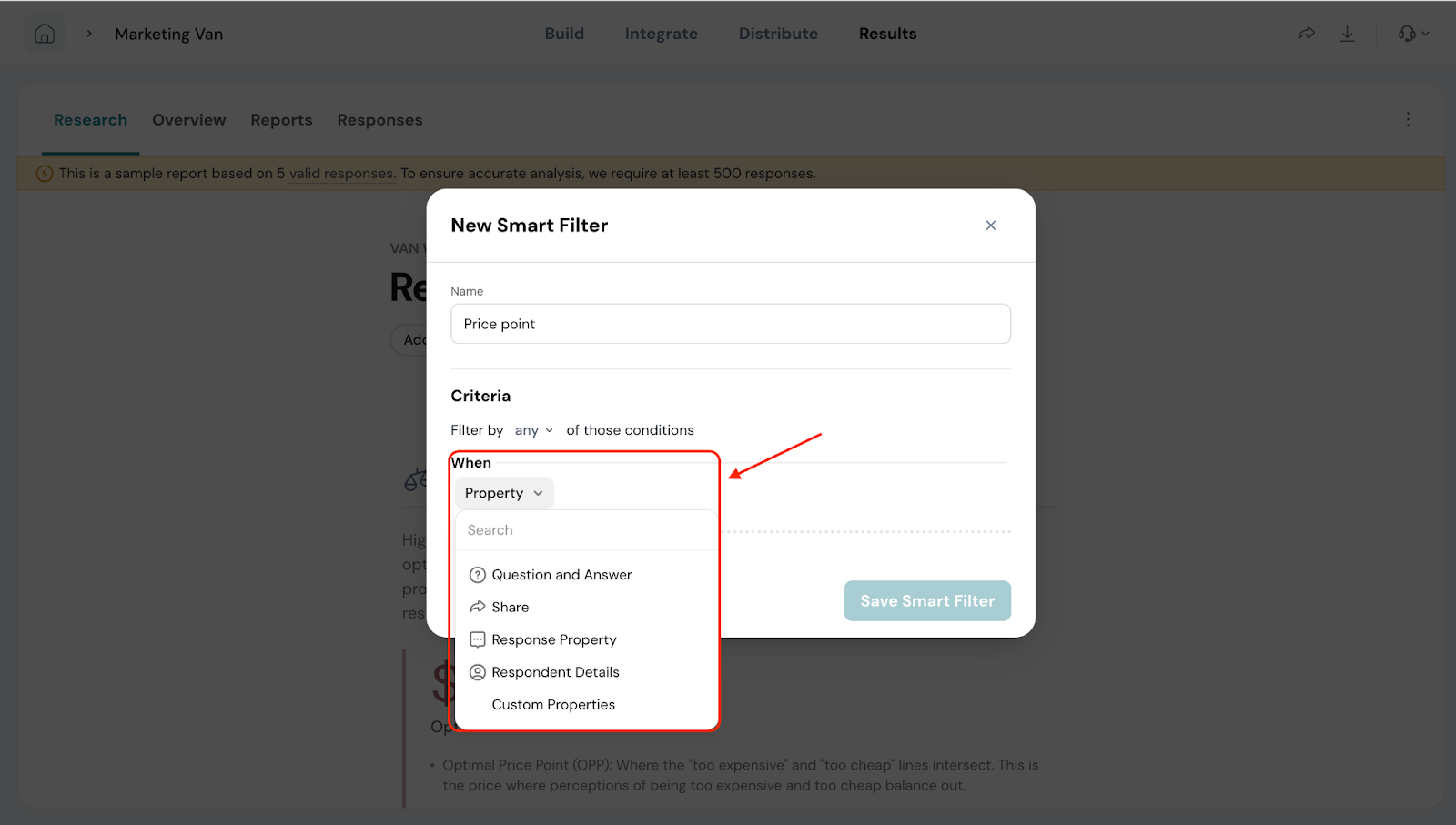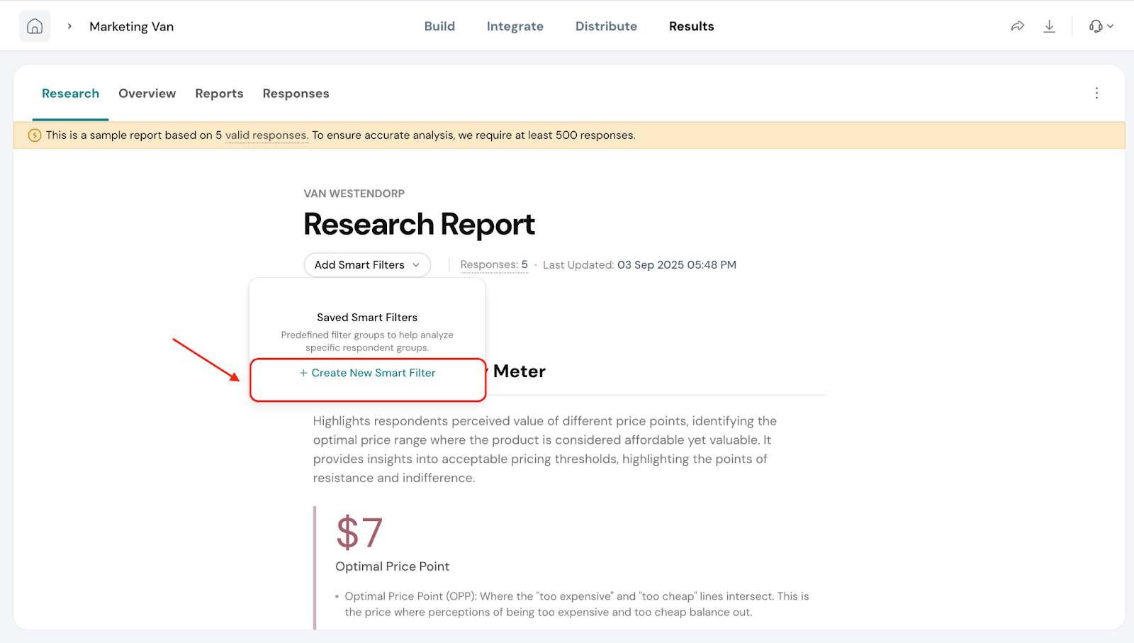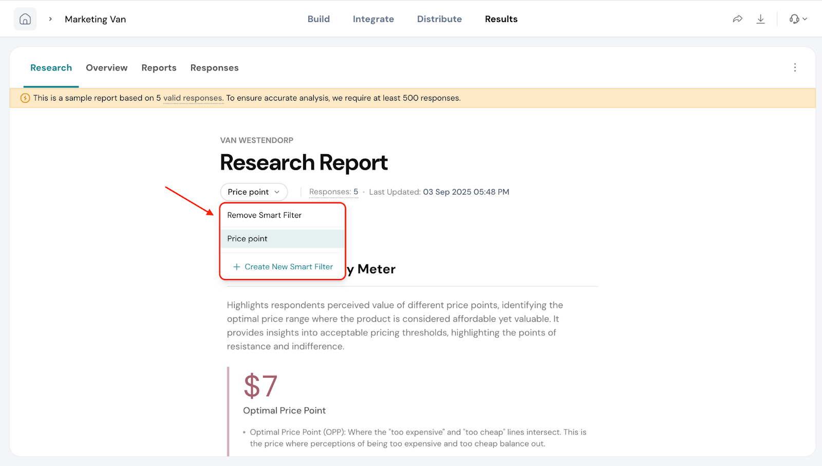 Smart FiltersSmart Filters are especially useful when you’ve added extra questions in your Van Westendorp survey. For example, if you ask respondents about their age group, location, or product usage, you can use a filter to compare pricing preferences between different segments.