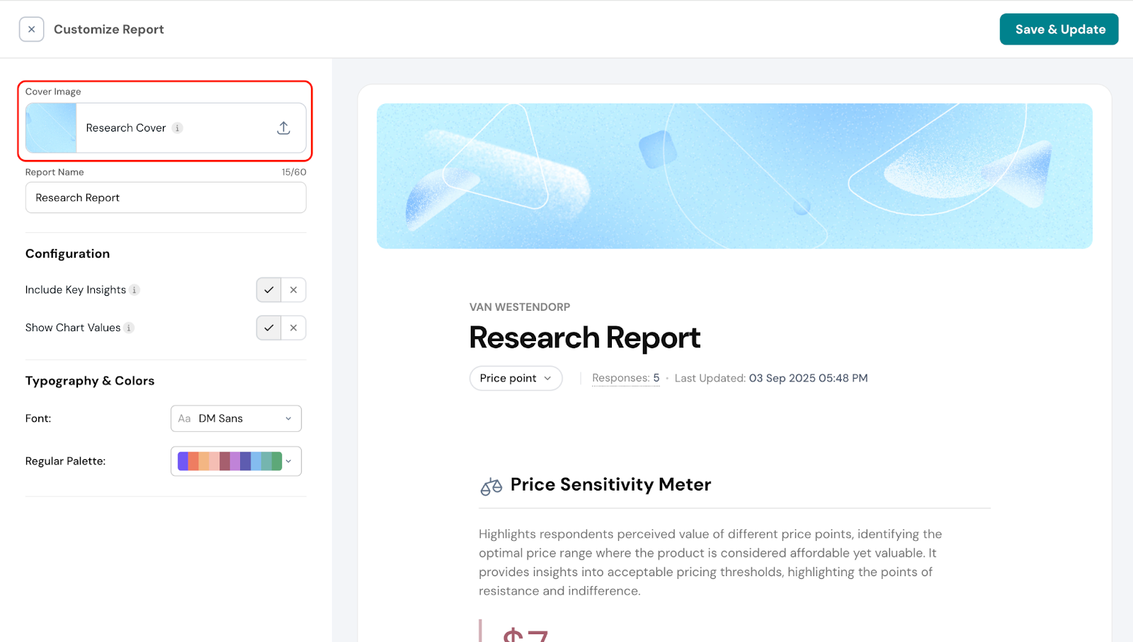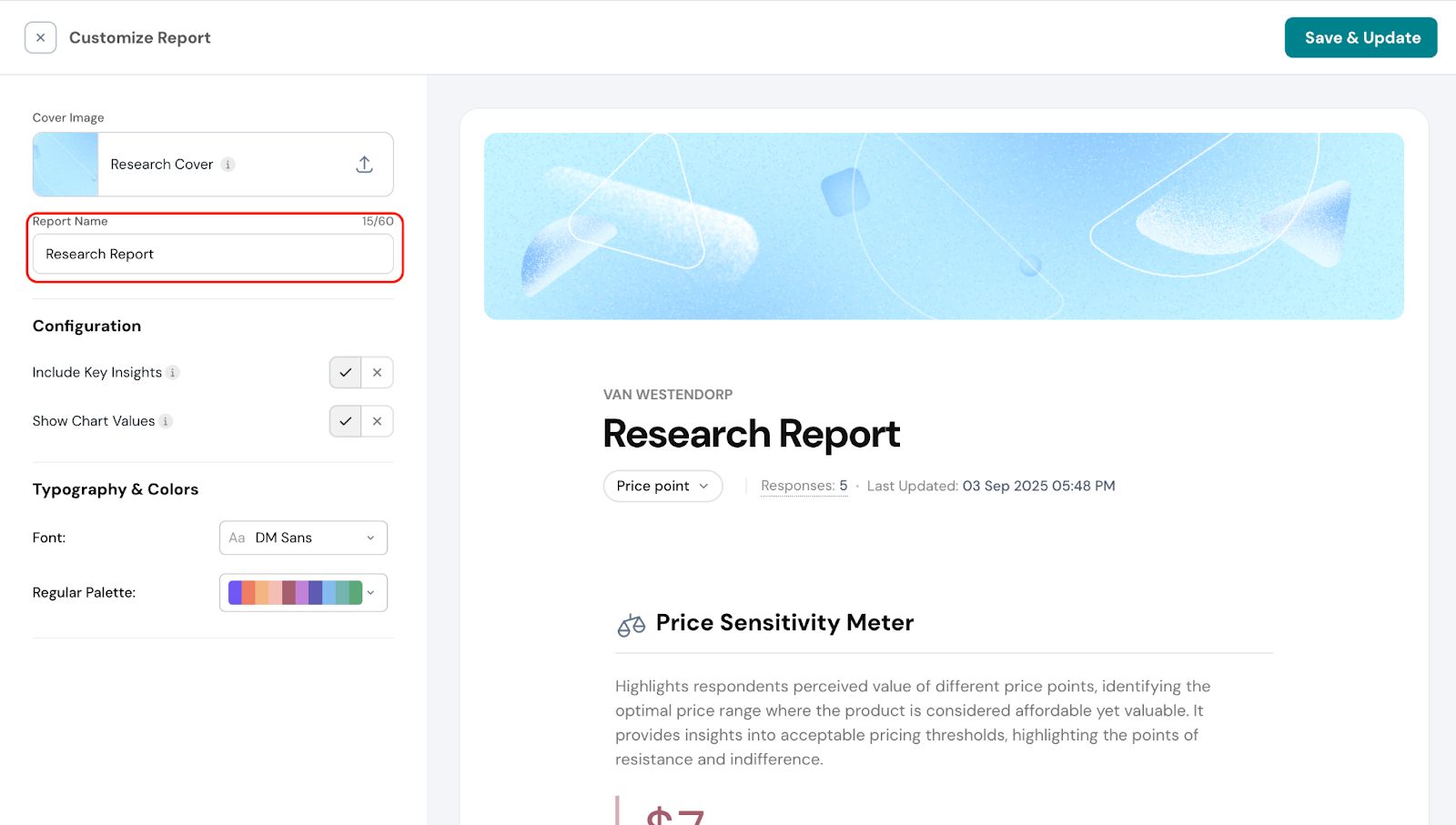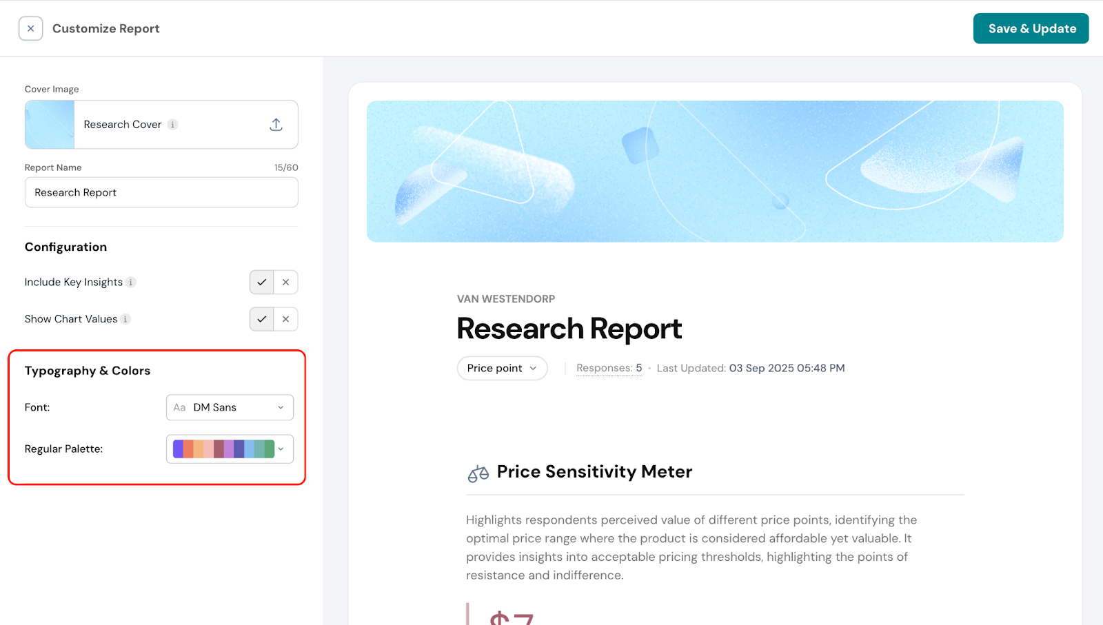 Customize typography and colors, including changing the font style and chart colors.Responses section