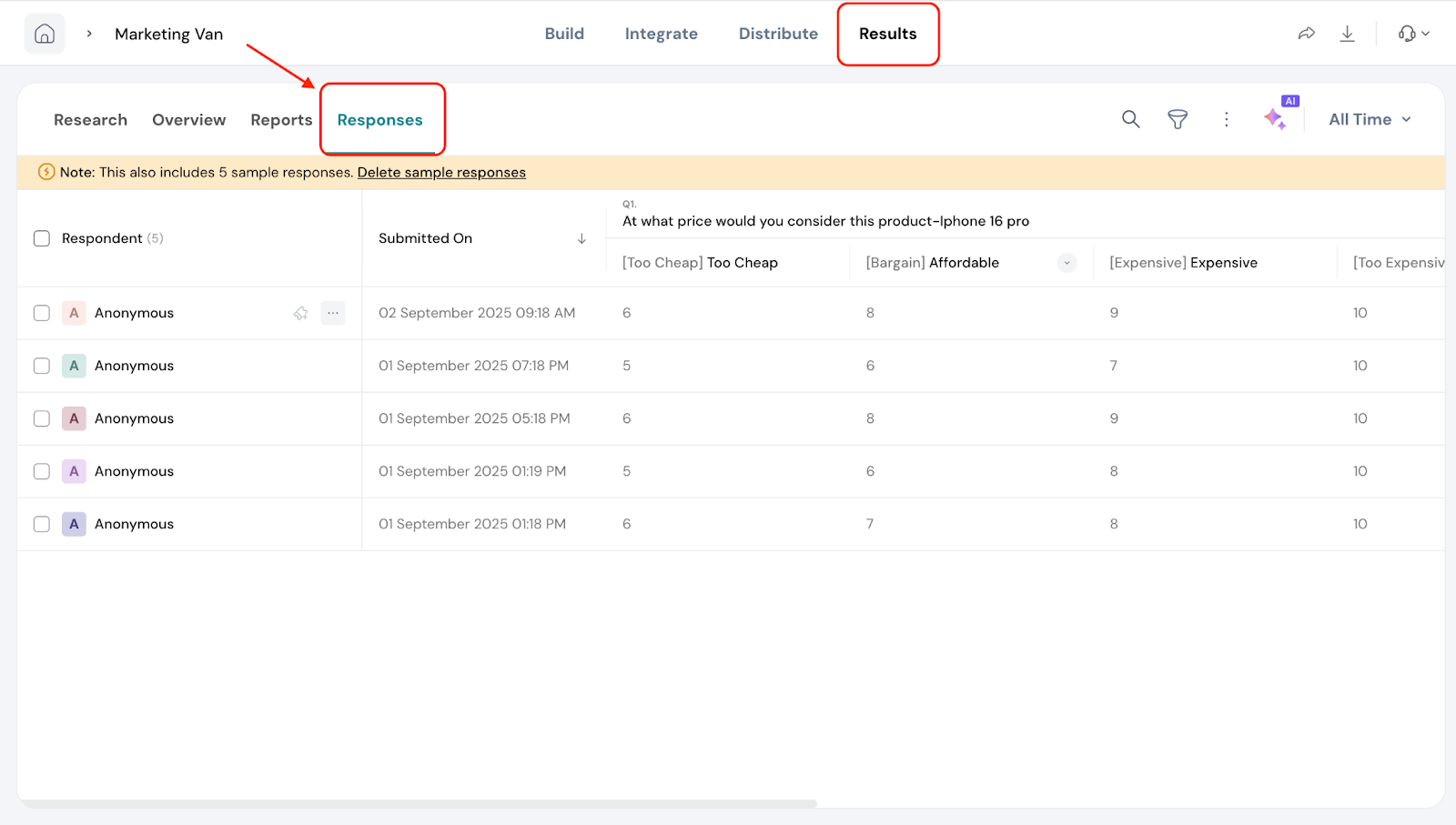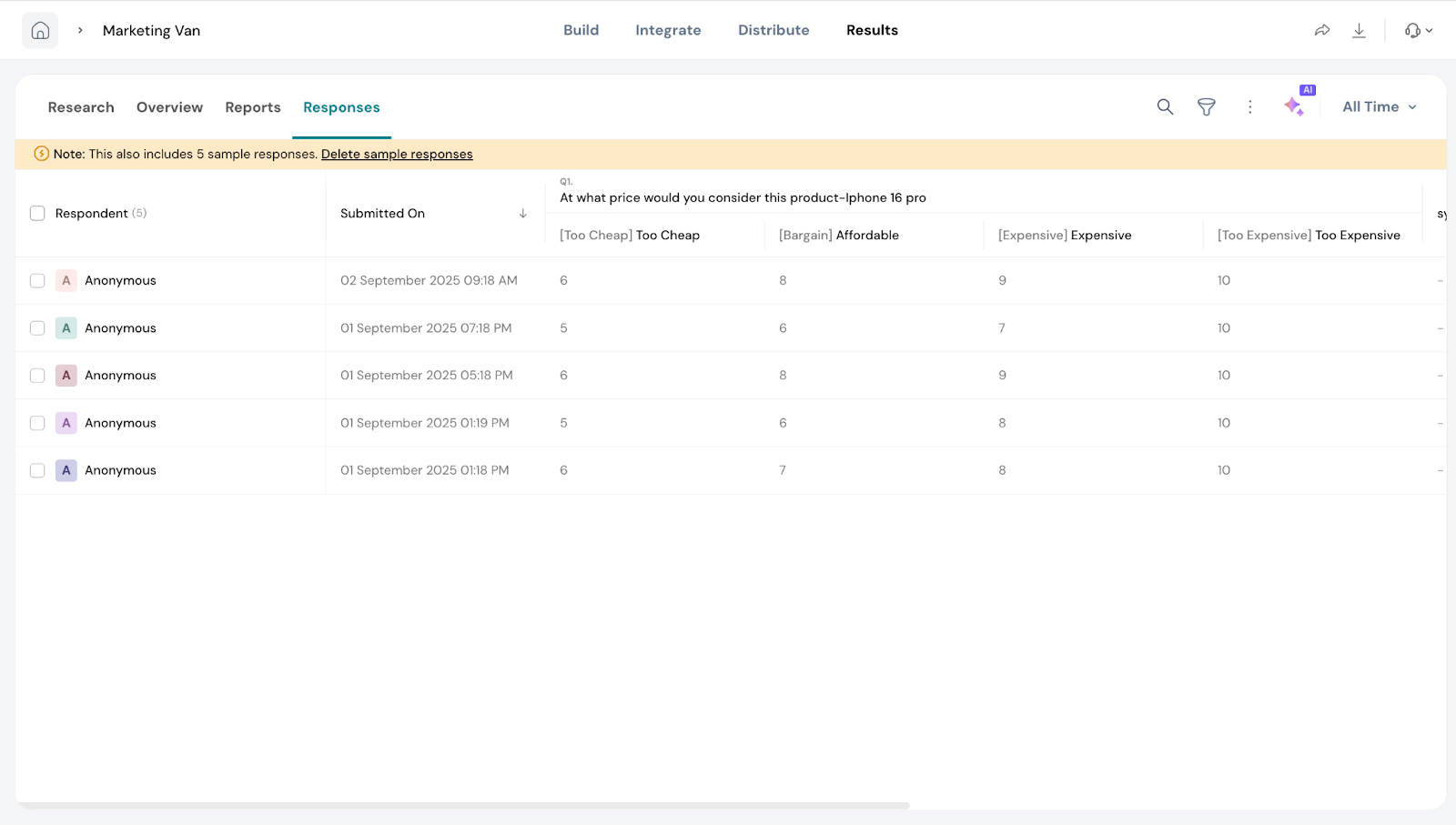 In this section, you can view how individual respondents answered for each price point. This allows you to see detailed responses and understand preferences at a granular level.