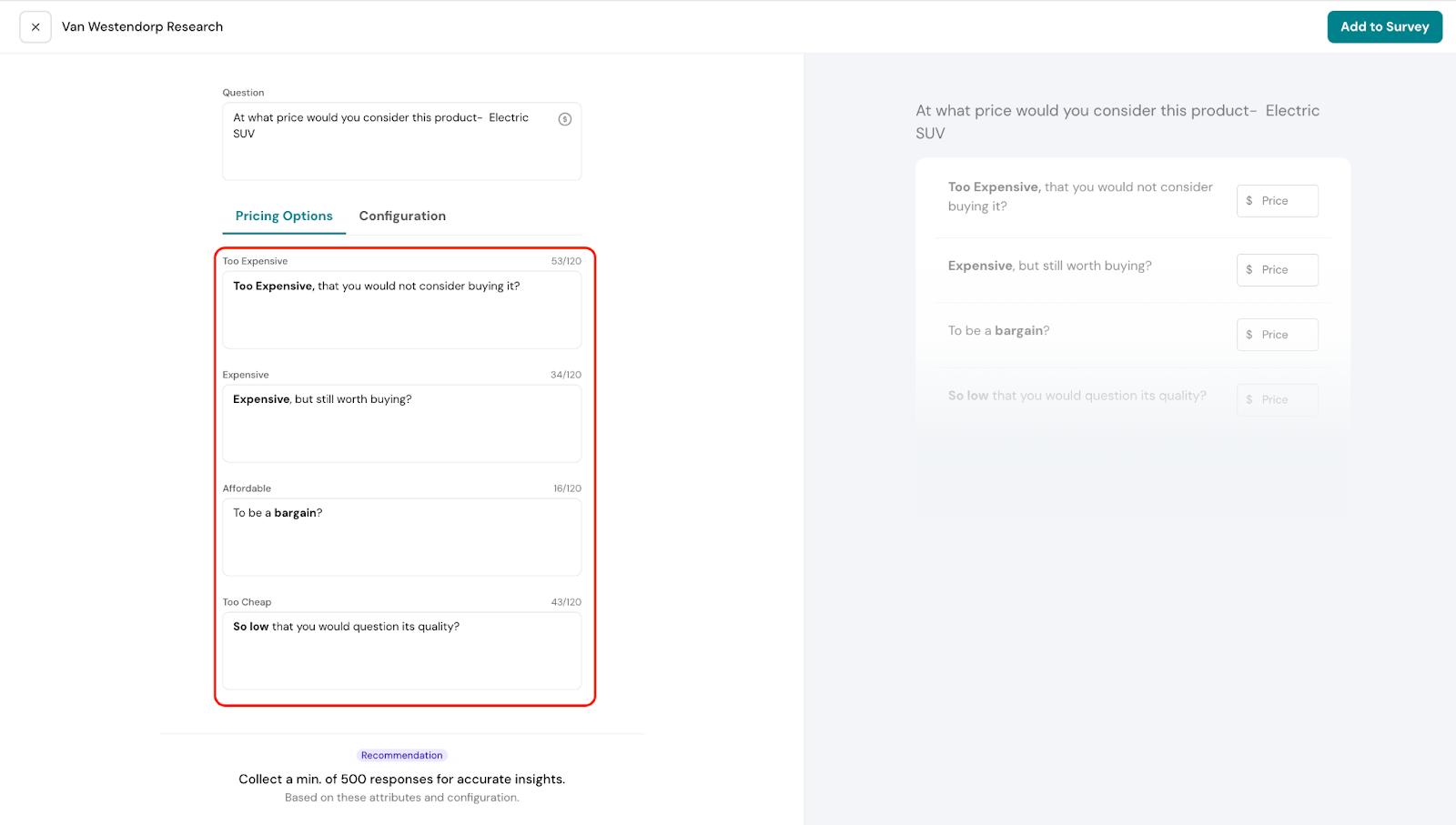 - Under Pricing Options, you’ll find four categories: Too Expensive, Expensive, Affordable, and Too Cheap. You can edit the text for each category to frame the questions in a way that best fits your research needs.