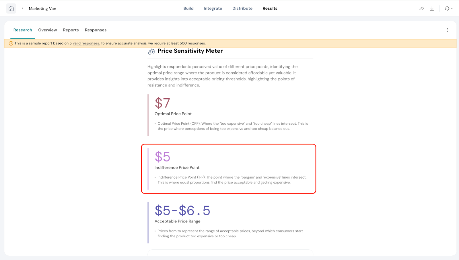 Example: In our report, the Indifference Price Point is $5. This is the critical pricing sweet spot where equal proportions of customers find the price acceptable versus getting expensive, marking the optimal balance before price resistance begins to impact purchase decisions.