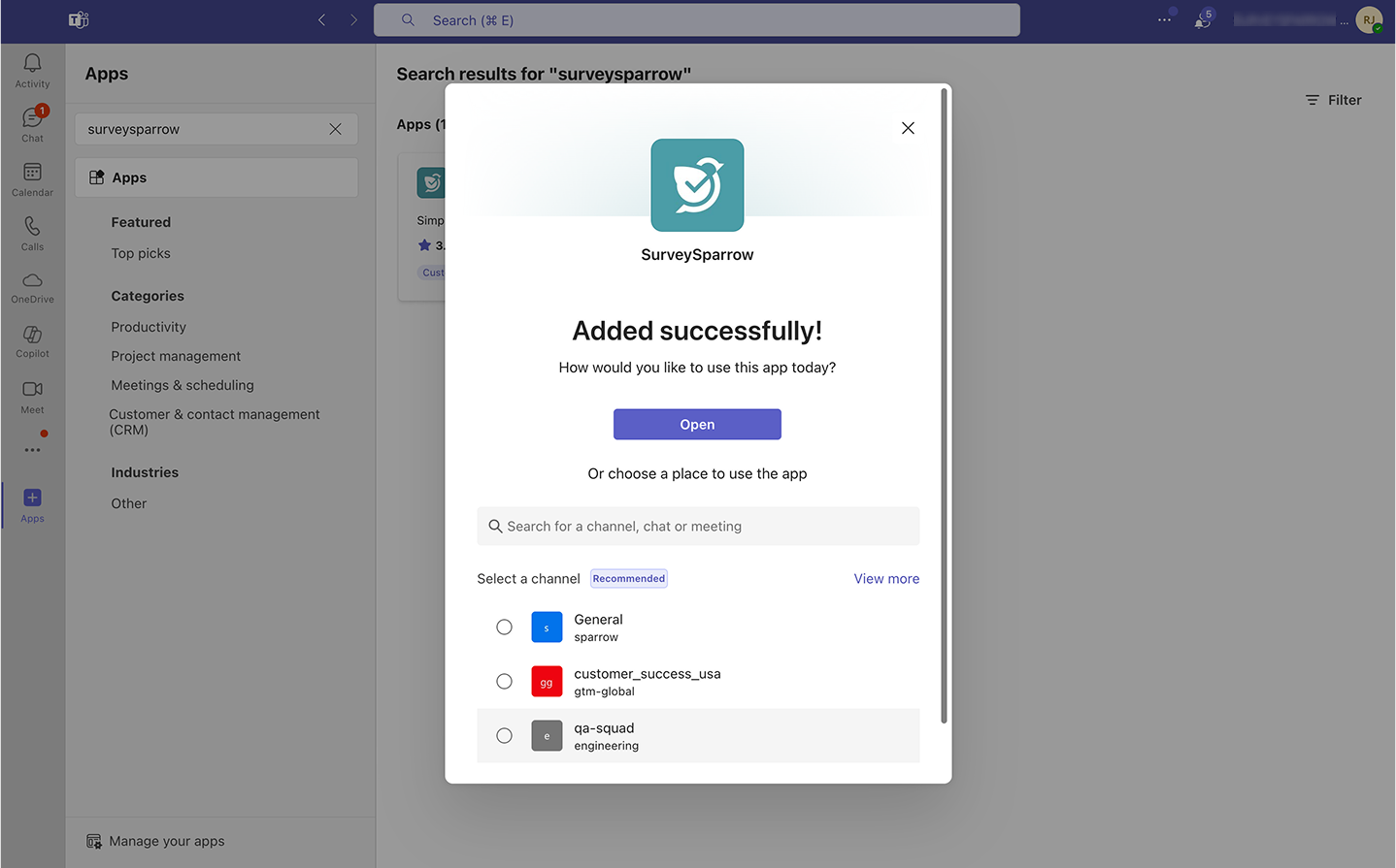 Note: You can add the SurveySparrow app only to a team’s channels and groups, not chats with individual users.